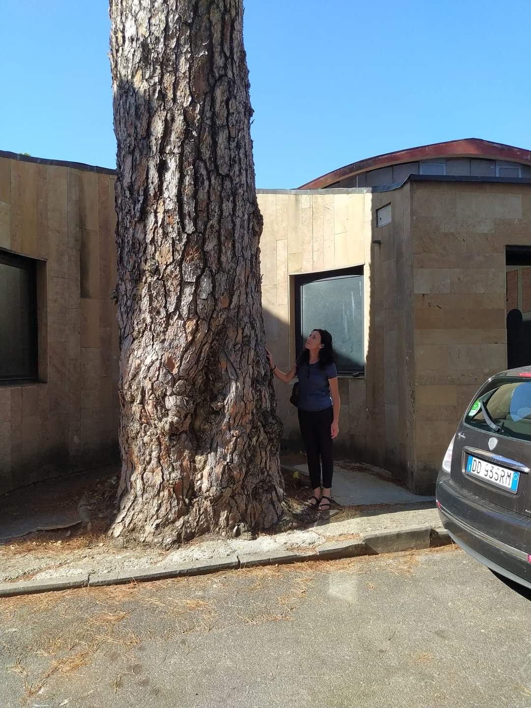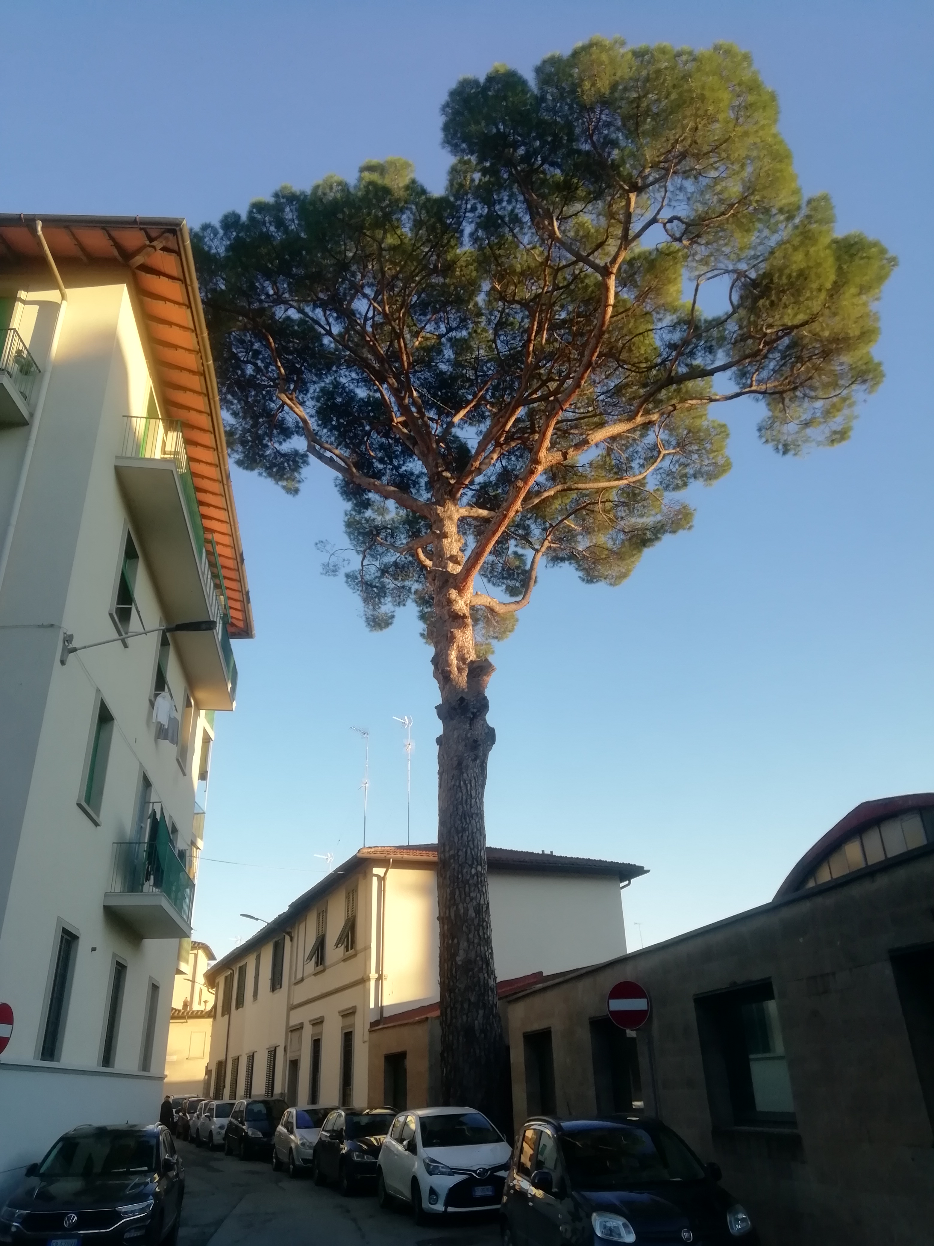 Bellissimo esemplare di pino, che ha dato il nome alla via, assai noto in città e che vegeta proprio al bordo della carreggiata stradale a ridosso di un fabbricato che è stato edificato con una nicchia in corrispondenza del bel tronco della pianta. L'albero è descritto e illustrato in alcune pubblicazioni sugli alberi monumentali toscani, quali "Toscana cento alberi da salvare" (Valido Capodarca, Vallecchi FI 1983) e "Patriarchi vegetali - Un patrimonio da salvare" (E. Bellini, S. Guidi, Polistampa FI 2005)