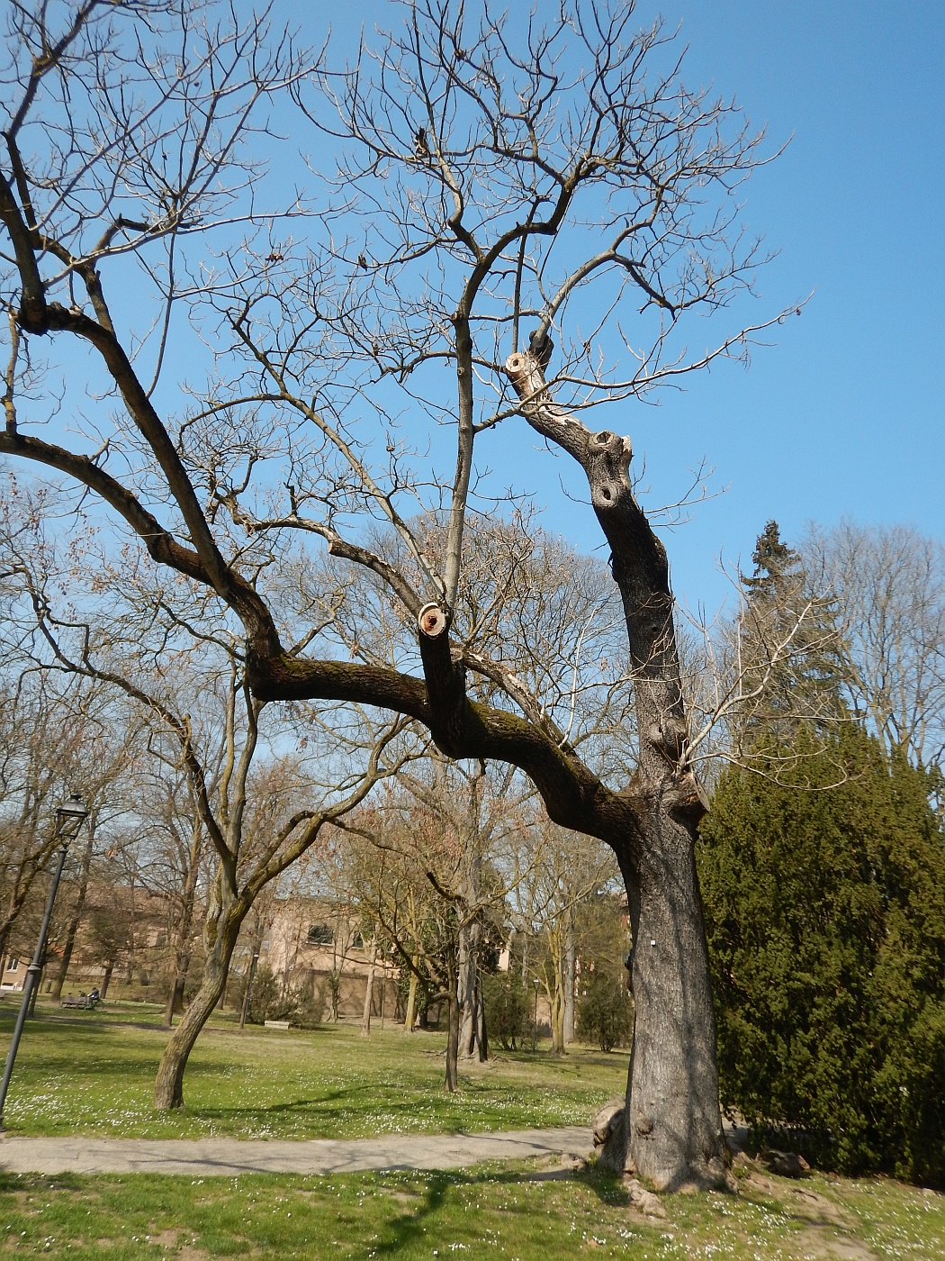 Esemplare di Paulonia di insolite dimensioni, vegetante nel Parco Massari. L'albero non si presenta in buone condizioni sanitarie, il fusto alla base presenta un voluminoso rigonfiamento e parte dell'apparato radicale affiorante. Il tronco cresce con evidente inclinazione, in origine vi era un primo palco con due rami inseriti quasi orizzontalmente, di cui ne rimane uno solo a sviluppo sinuoso e potato (dell'altro ramo ne rimane solo un corto moncone reciso), il fusto centrale ha portamento più verticale, anch'esso sinuoso e con visibili potature di rami secondari.