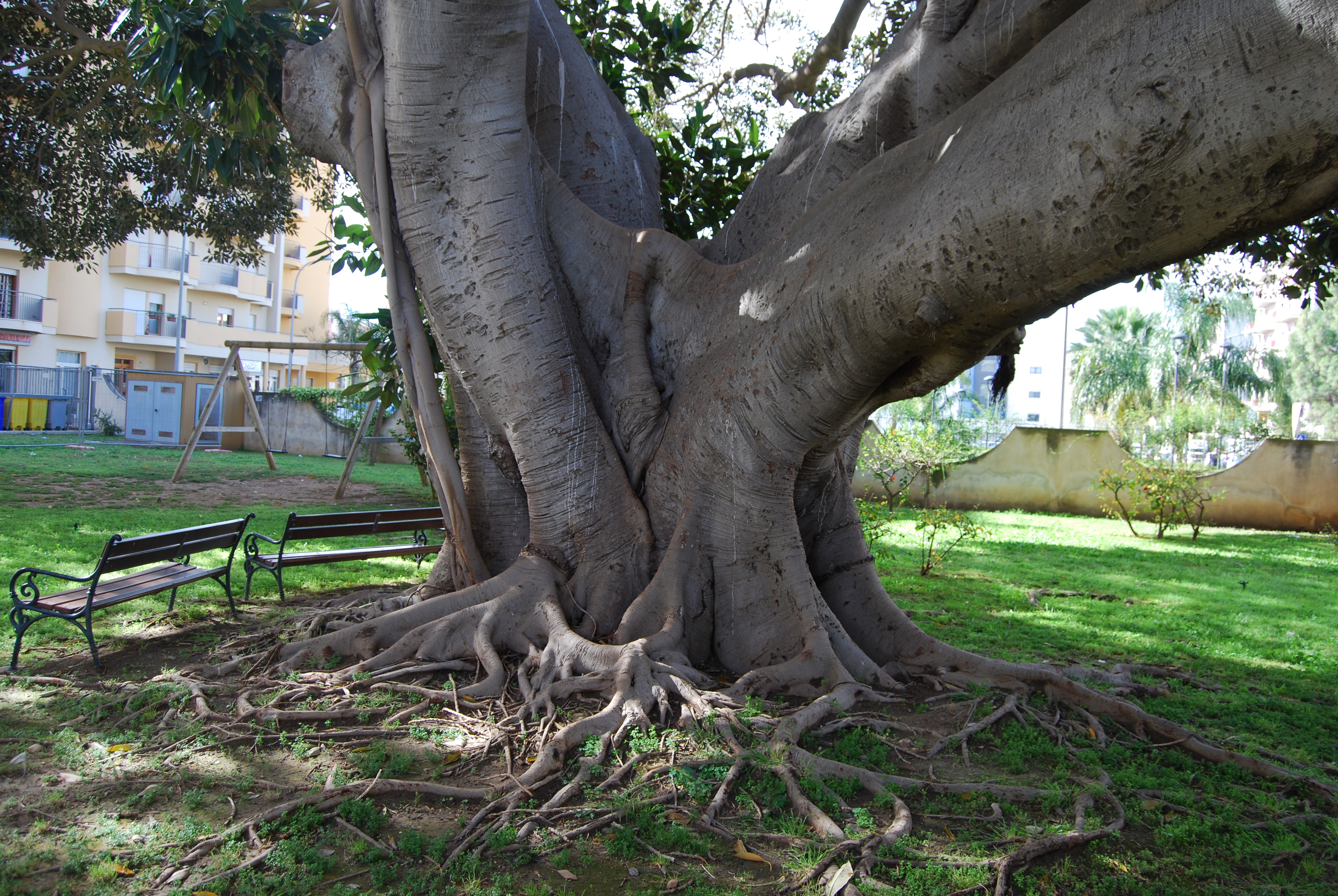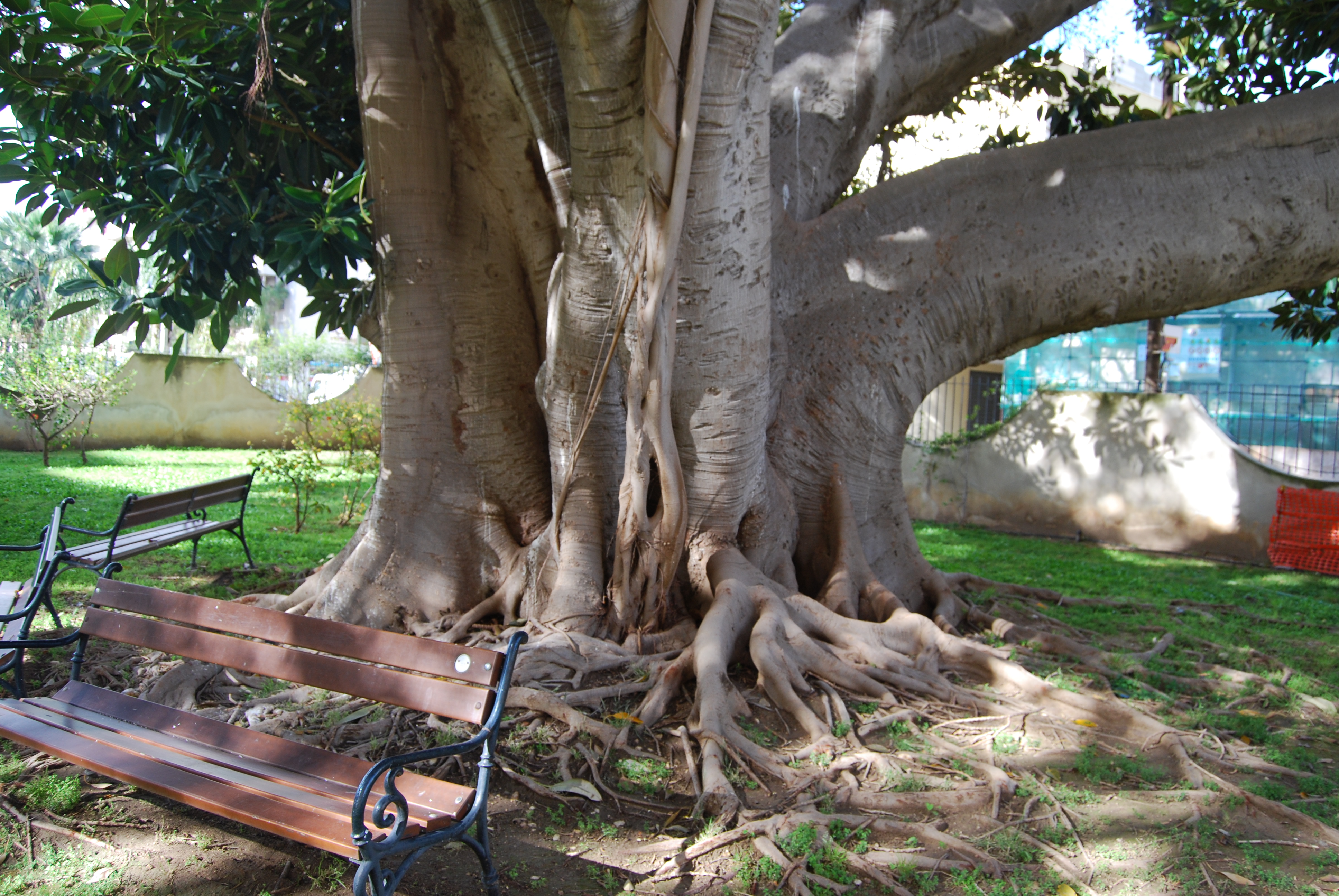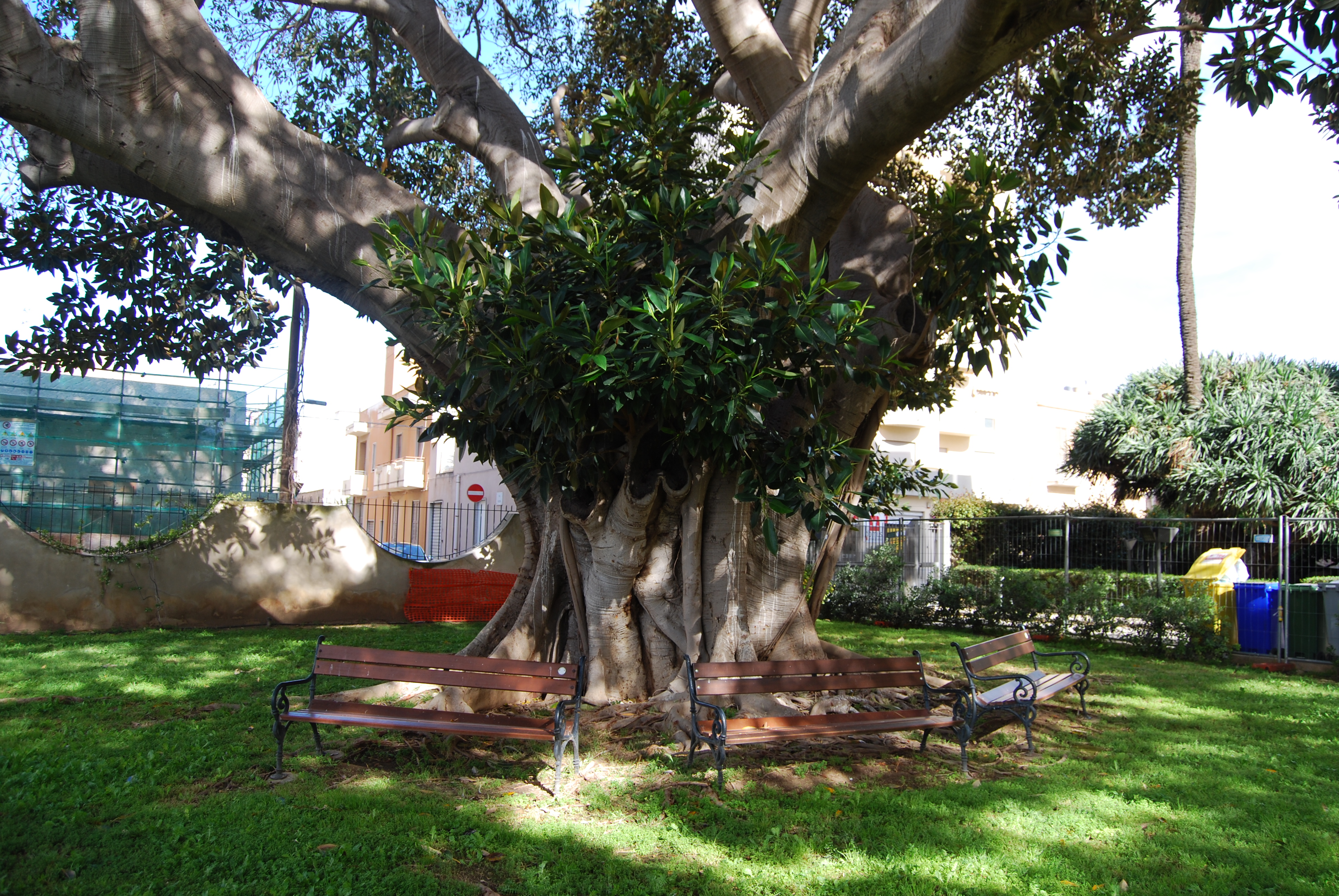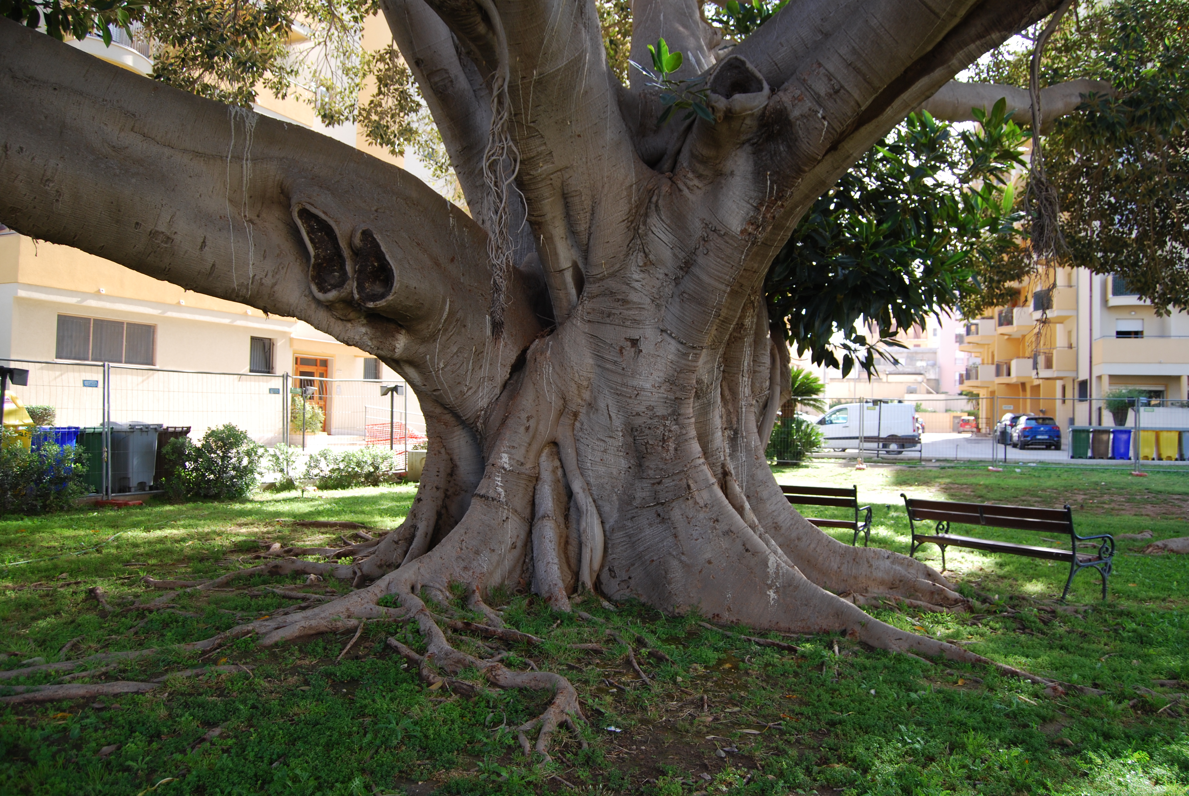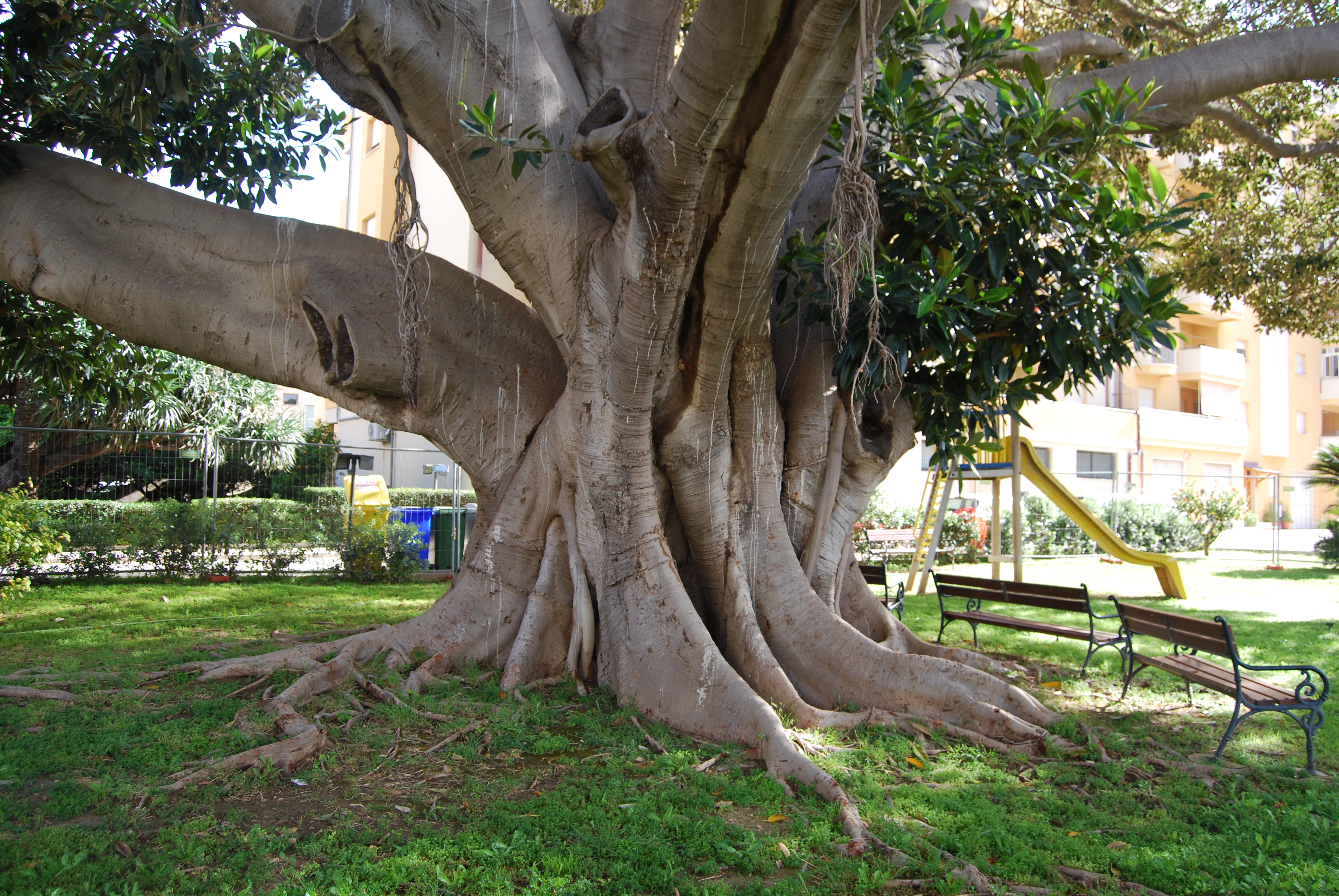Si tratta di un grande Ficus piantato nel cortile interno di un maxi-condominio, che spande la sua ampia chioma su Via Villa Rosina. A pochi metri di distanza c'è una Dracena drago molto interessante
