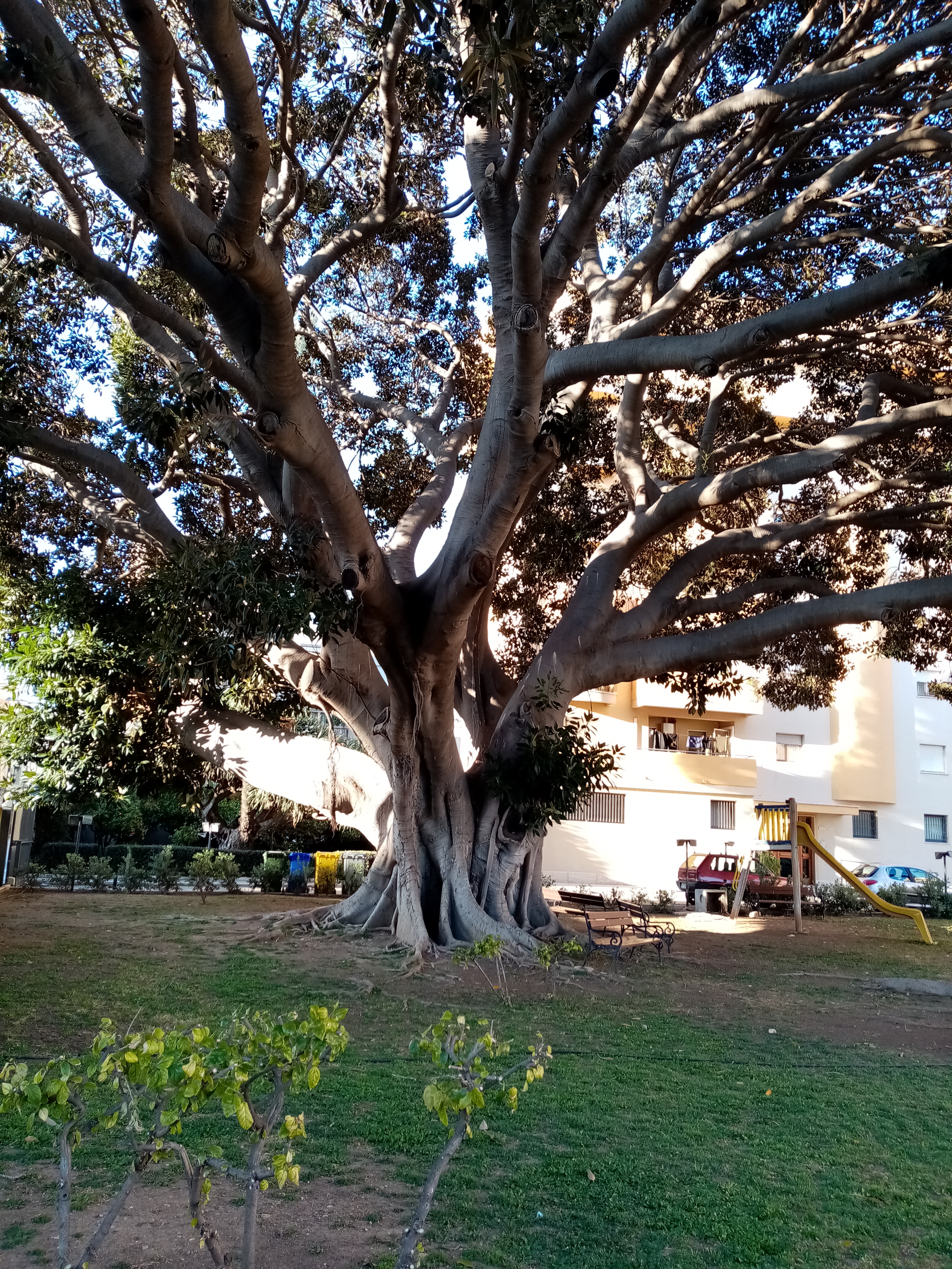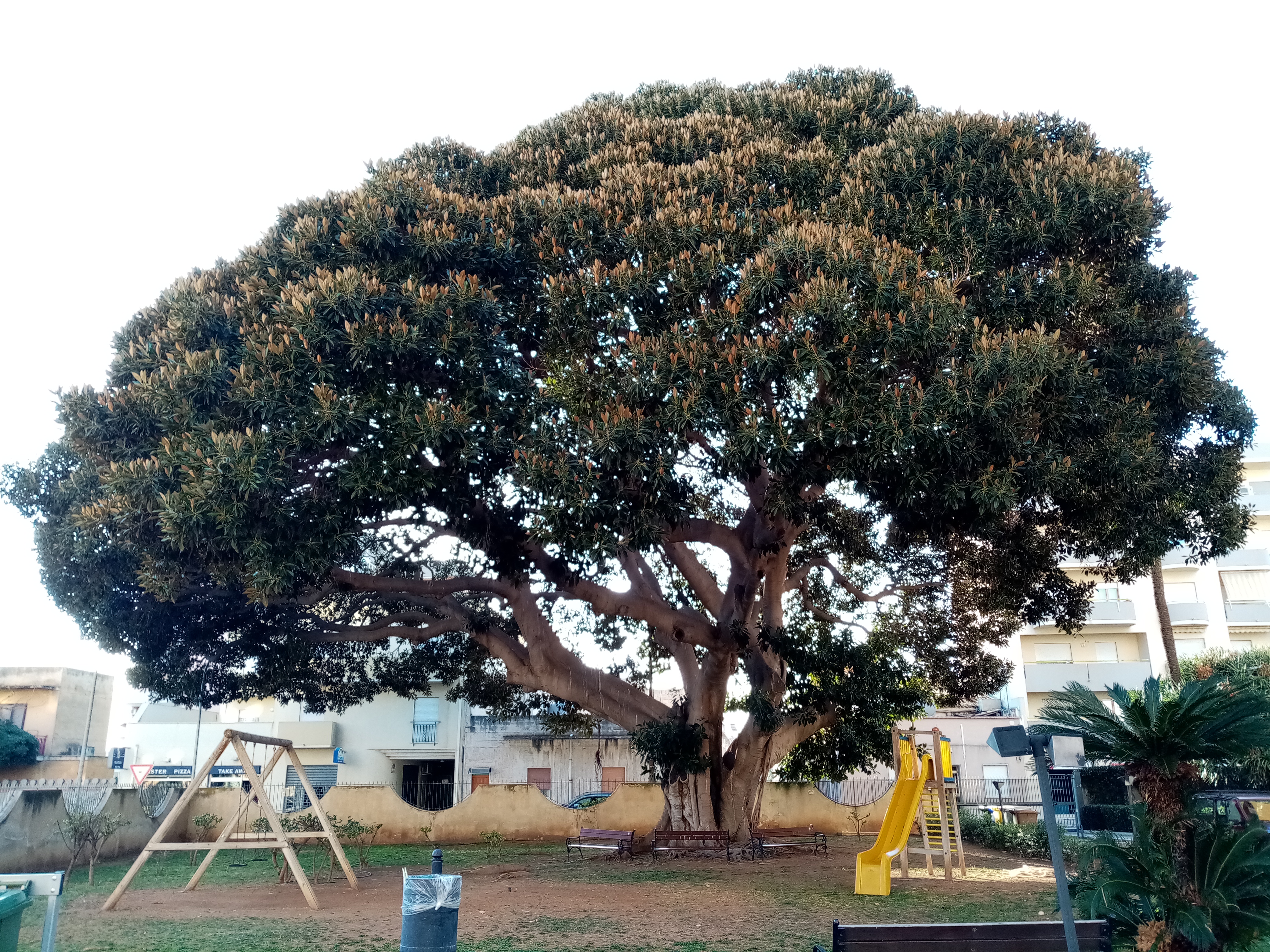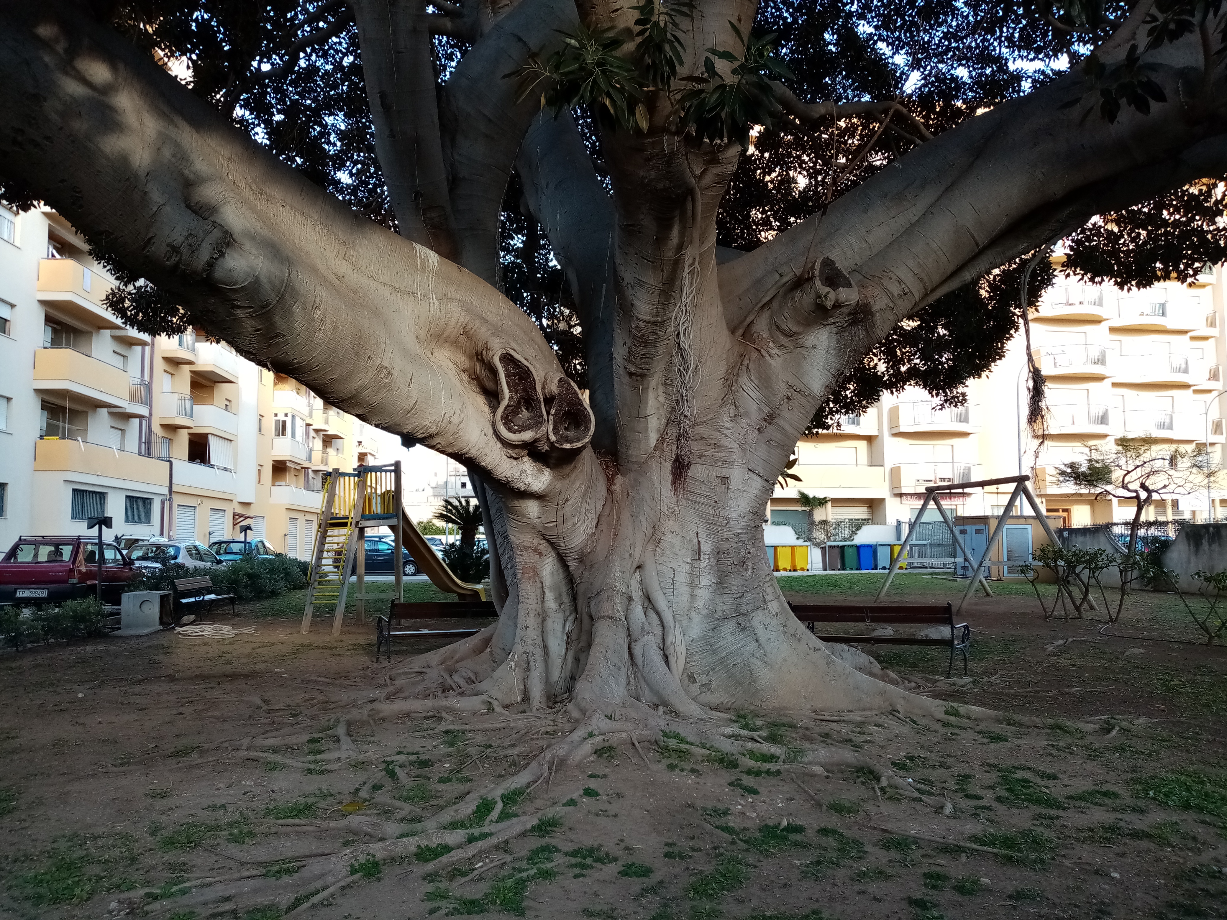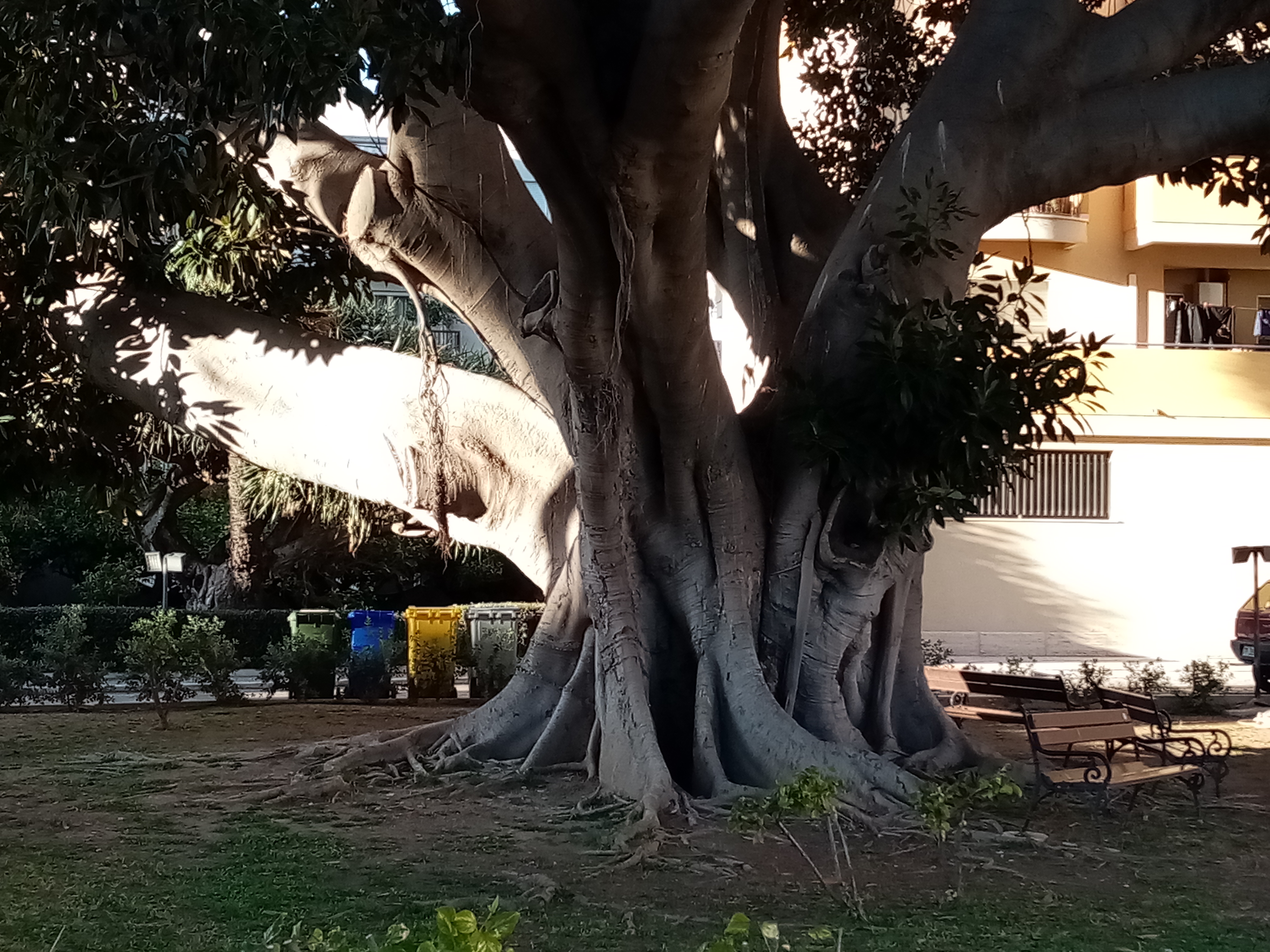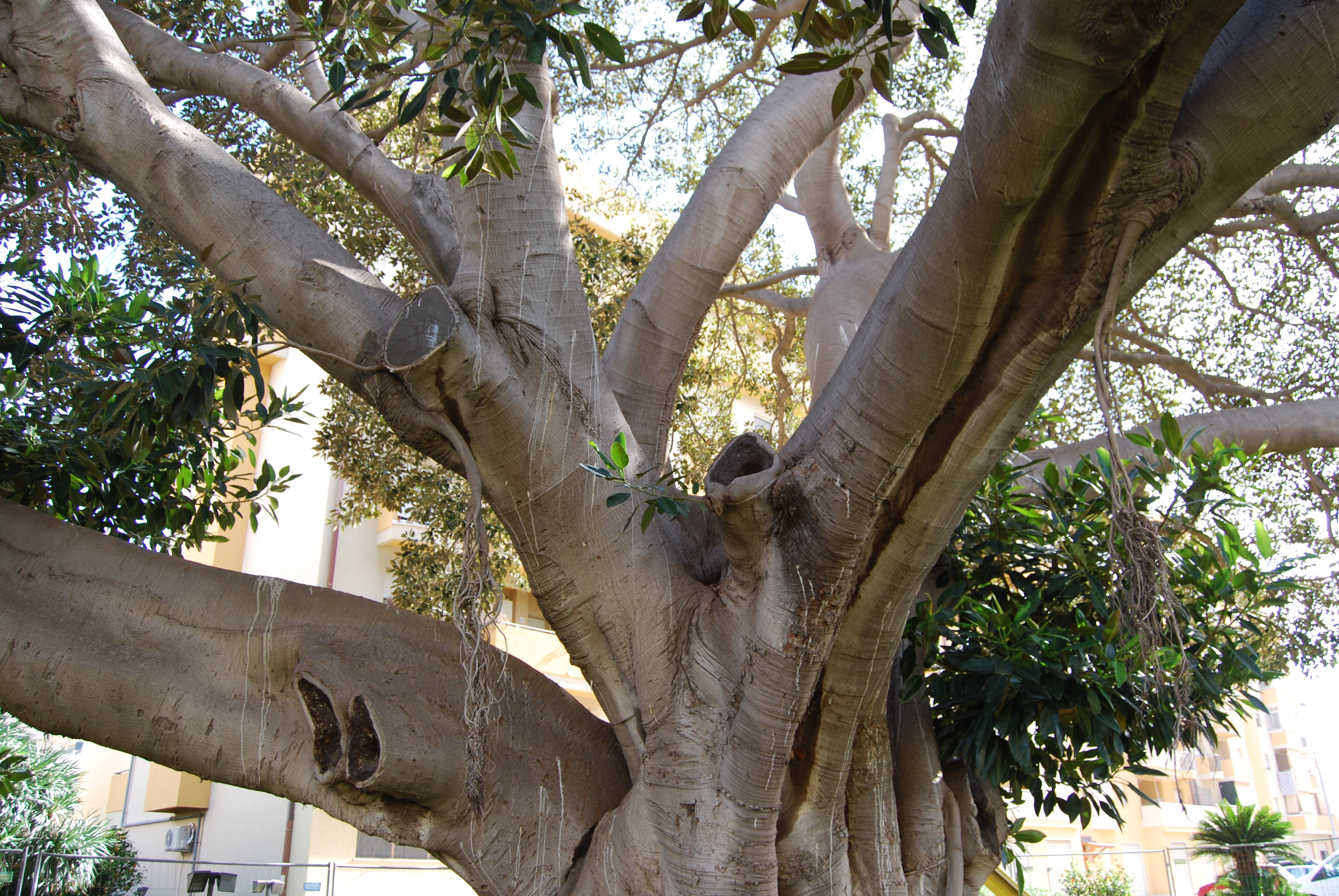 Si tratta di un grande Ficus piantato nel cortile interno di un maxi-condominio, che spande la sua ampia chioma su Via Villa Rosina. A pochi metri di distanza c'è una Dracena drago molto interessante
