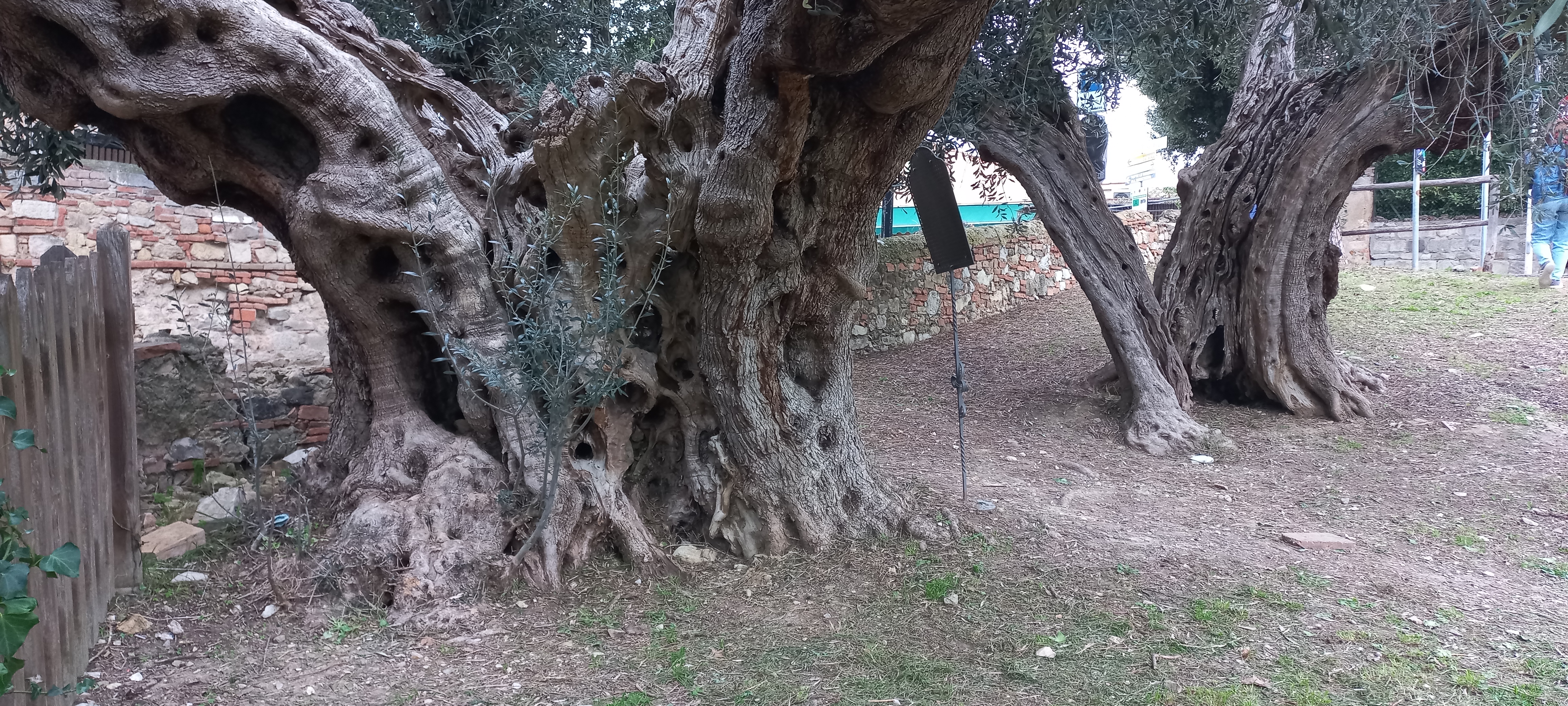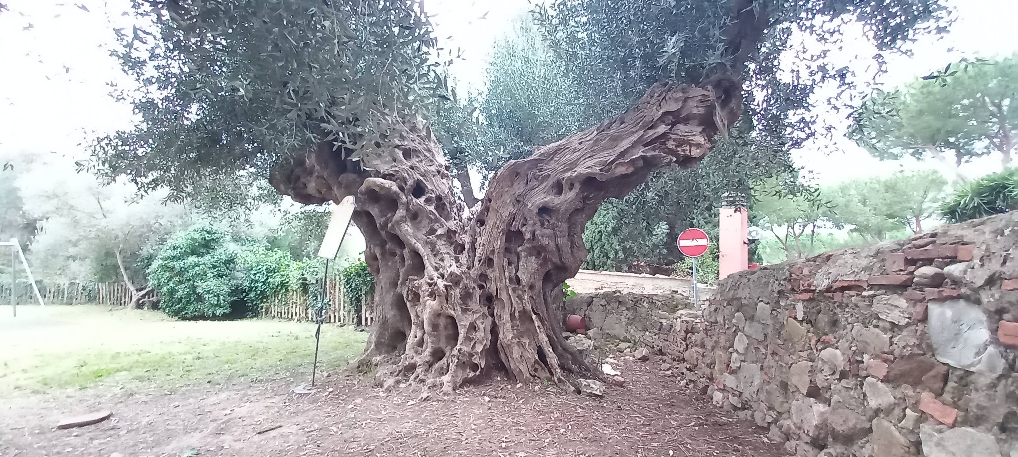 Olivo presso girdino pubblico. Un cartello in legno riporta scritto "data di nascita 1720 circa".