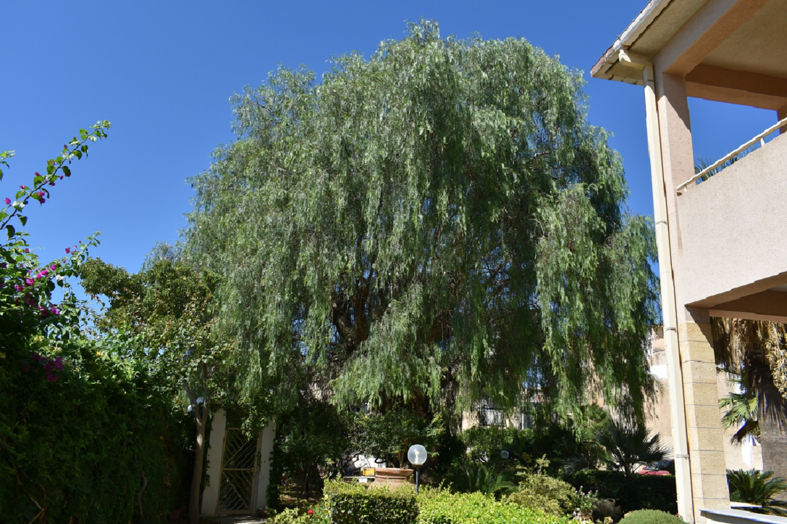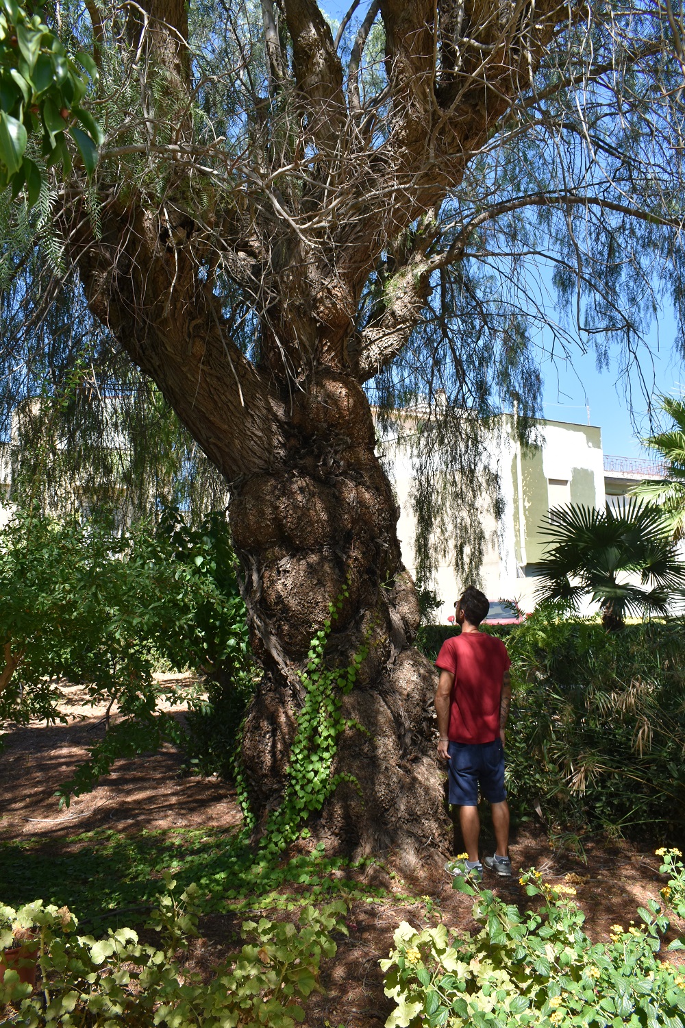 Si tratta di un bel esemplare di falso pepe, ubicato nel giardino della villa del Dr. Vincenzo Bono, a Marausa, una delle frazioni che hanno costituito il nuovo Comune di Misiliscemi (TP). L'albero è stato sottoposto a potature in passato, ma la chioma rimane regolare ed ampia (per la specie). Pur essendo di dimensioni rilevanti, non dovrebbe essere vecchio (forse è stato piantato quando è stata costruita la villa). La misura è quella minima, non presa a 130 cm da terra, per non comprendere alcune protuberanze del tronco, su cui si notano pezzi di resina, catramosa.