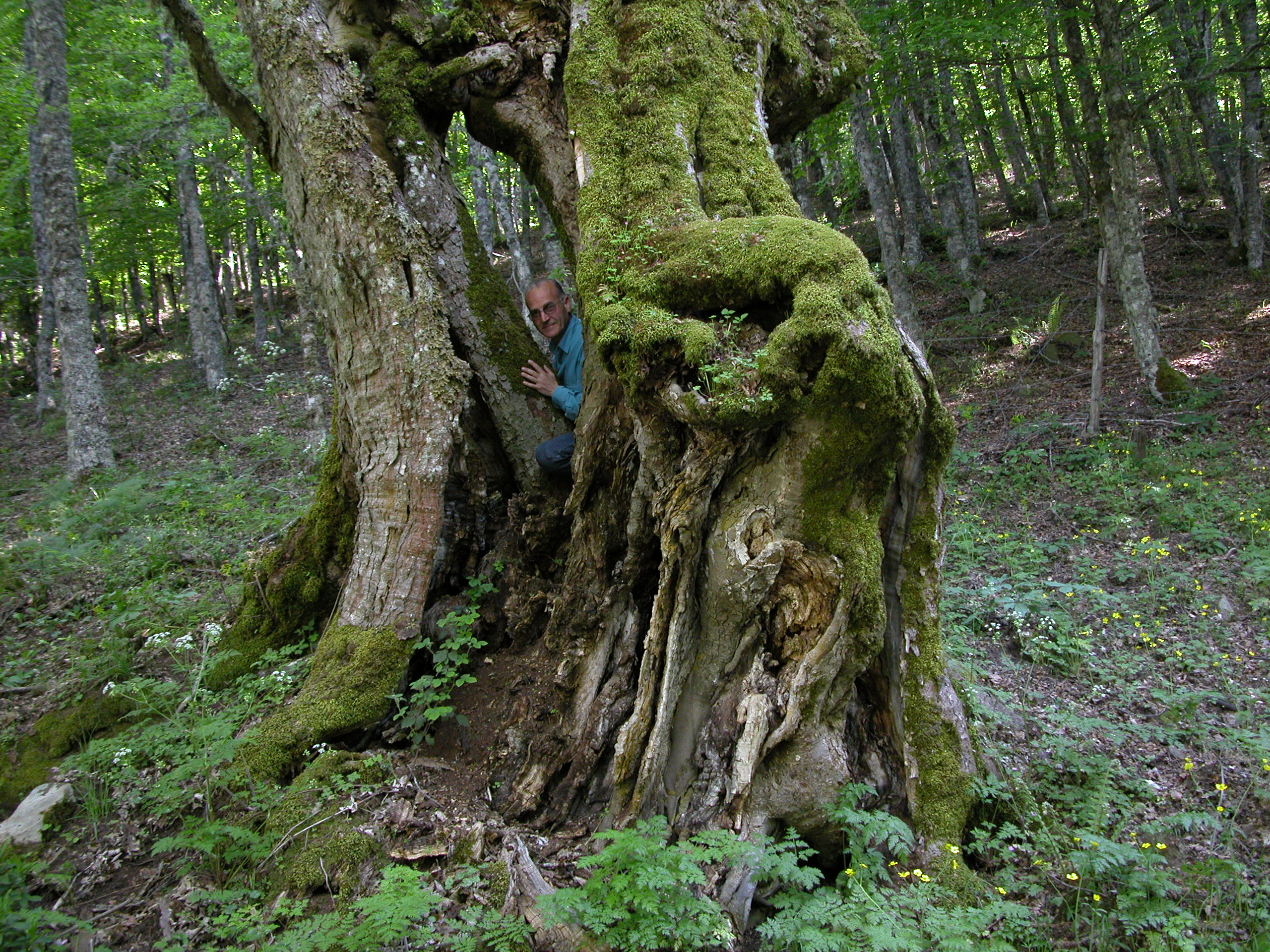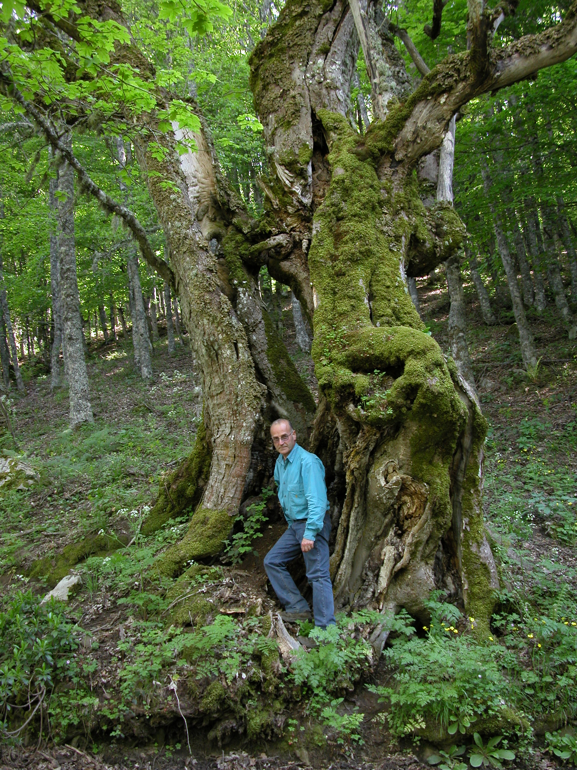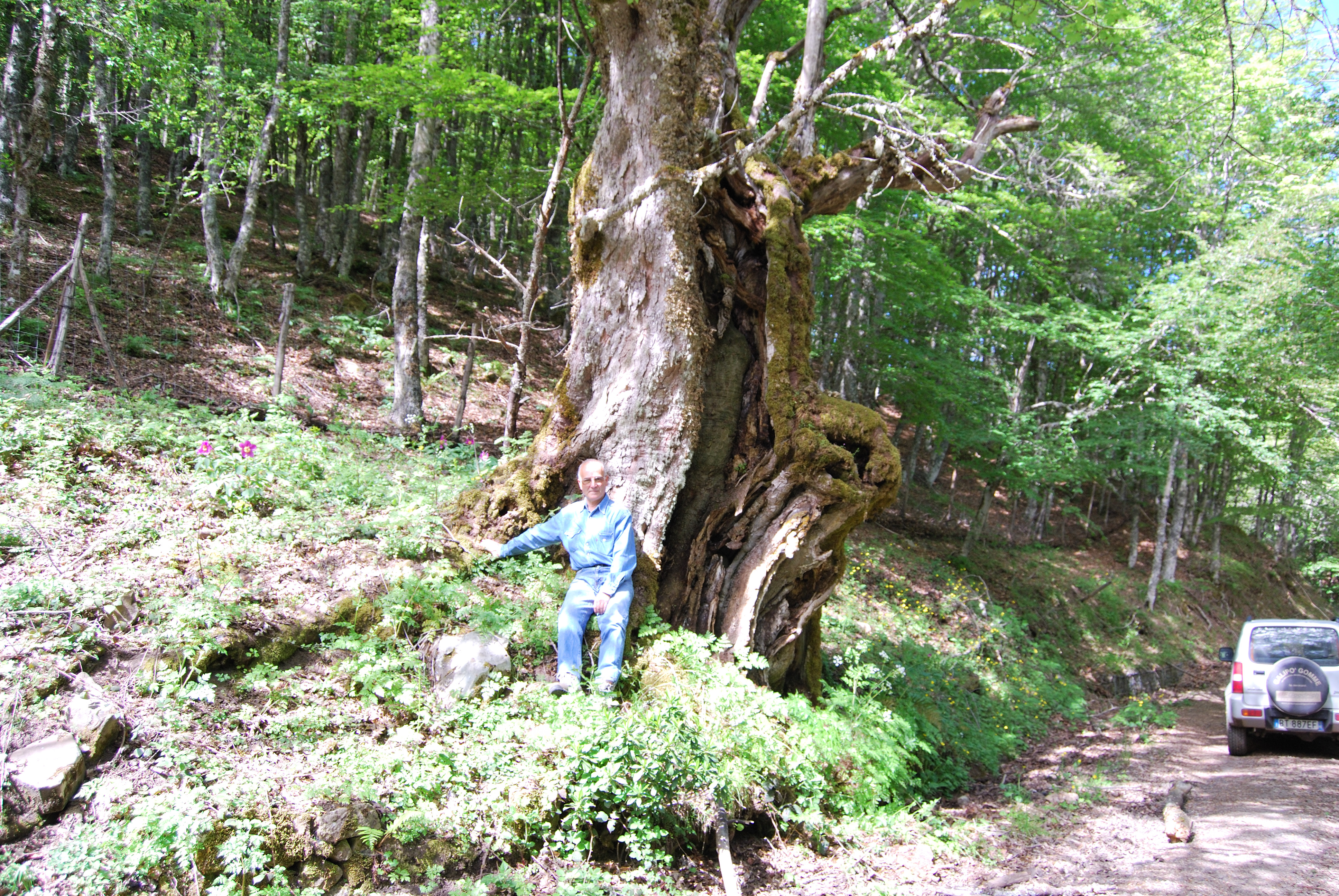 Vecchio e grosso esemplare di Acero di monte, sul bordo sinistro della vecchia sterrata, dal tronco cariato diviso in due parti, per causa probabilmente di un fulmine.