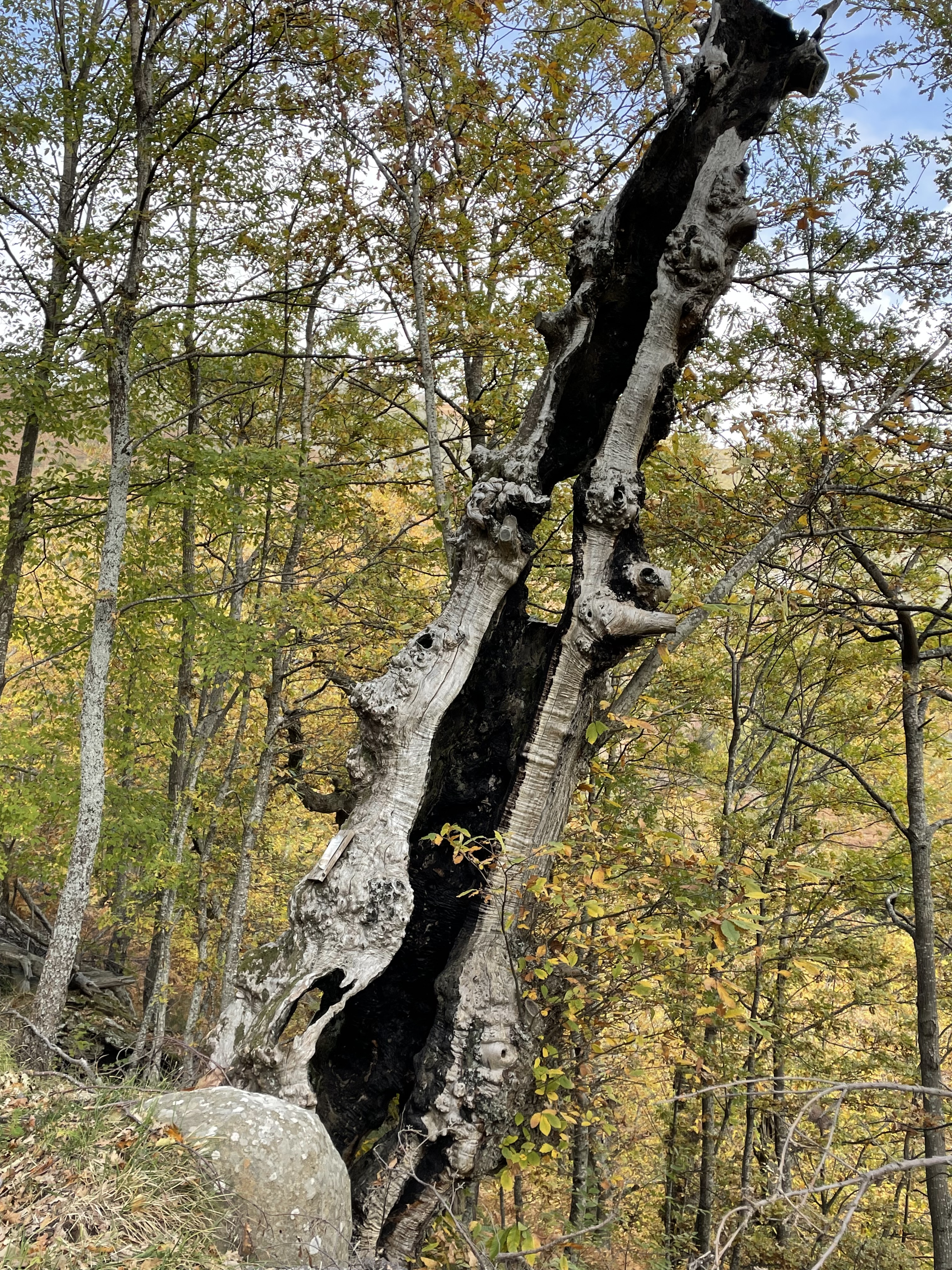 Anche questo esemplare del Castagneto monumentale dello Scesta si trova immediatamente sotto strada, poco prima dei due Castagni dello Gnomo. Non è di grosse dimensioni, ma è costituito da un fusto inclinato a valle, lungo 7-8 metri, completamente cavo dalla base alla cima, con una spaccatura che lo attraversa verticalmente. Internamente è carbonizzato ma comunque sempre vitale.
