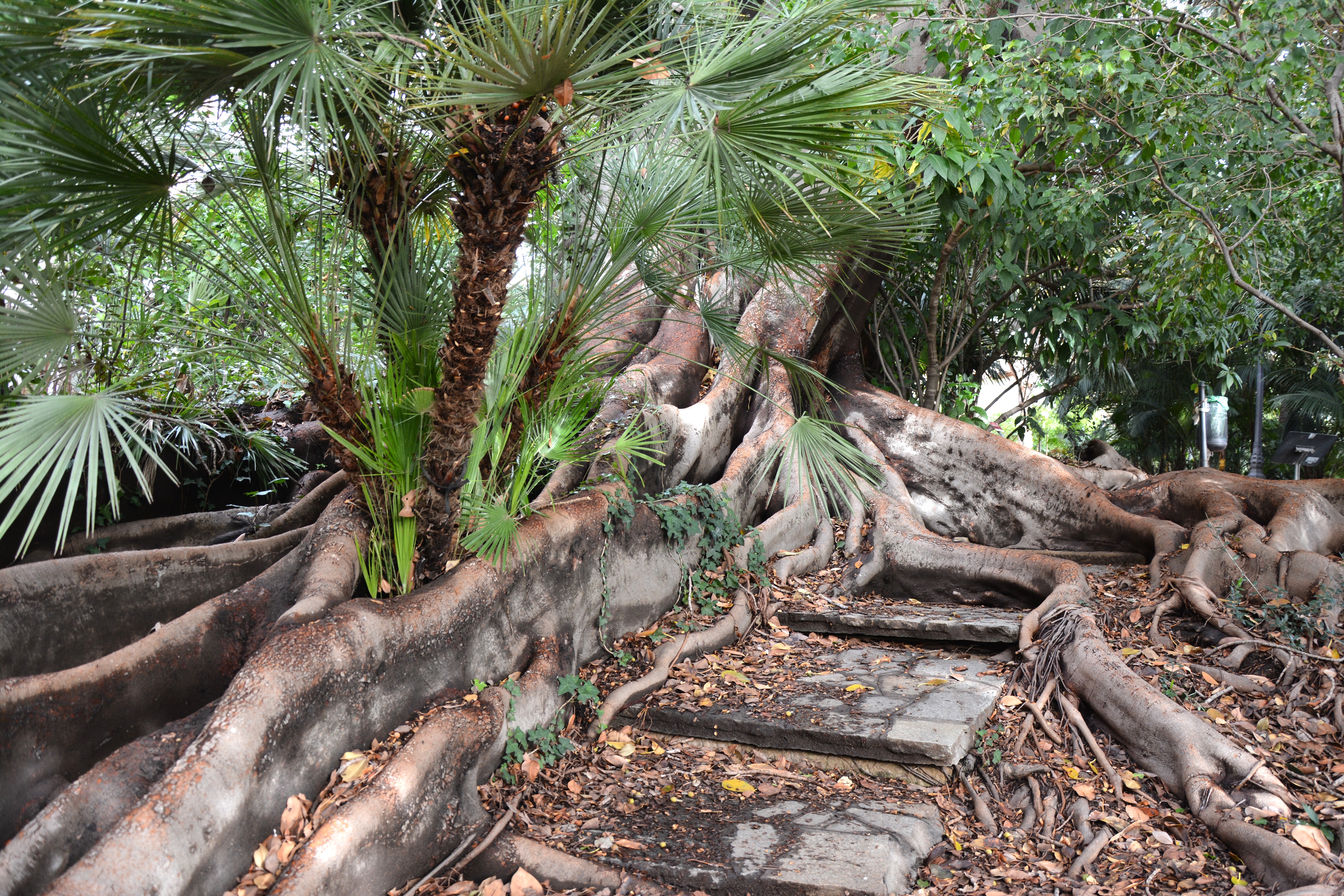 il primo grande Ficus che si incontra salendo il lato sinistro del giardino di Villa Ormond; un cartello avvisa che il "percorso è sconnesso a causa della naturale crescita delle radici di Ficus macrophylla"