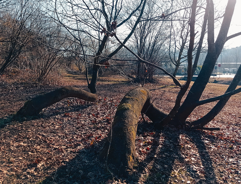 Giovani esemplari di quercia rossa americana che hanno una particolarissima forma del fusto dovuta alla presenza di una fitta coltre di rovi nei loro primi anni di vita. Dopo una serie di contorsioni hanno "guadagnato" la luce e sono tornate a crescere dritte. In futuro dovrebbero diventare una cosa molto bella!