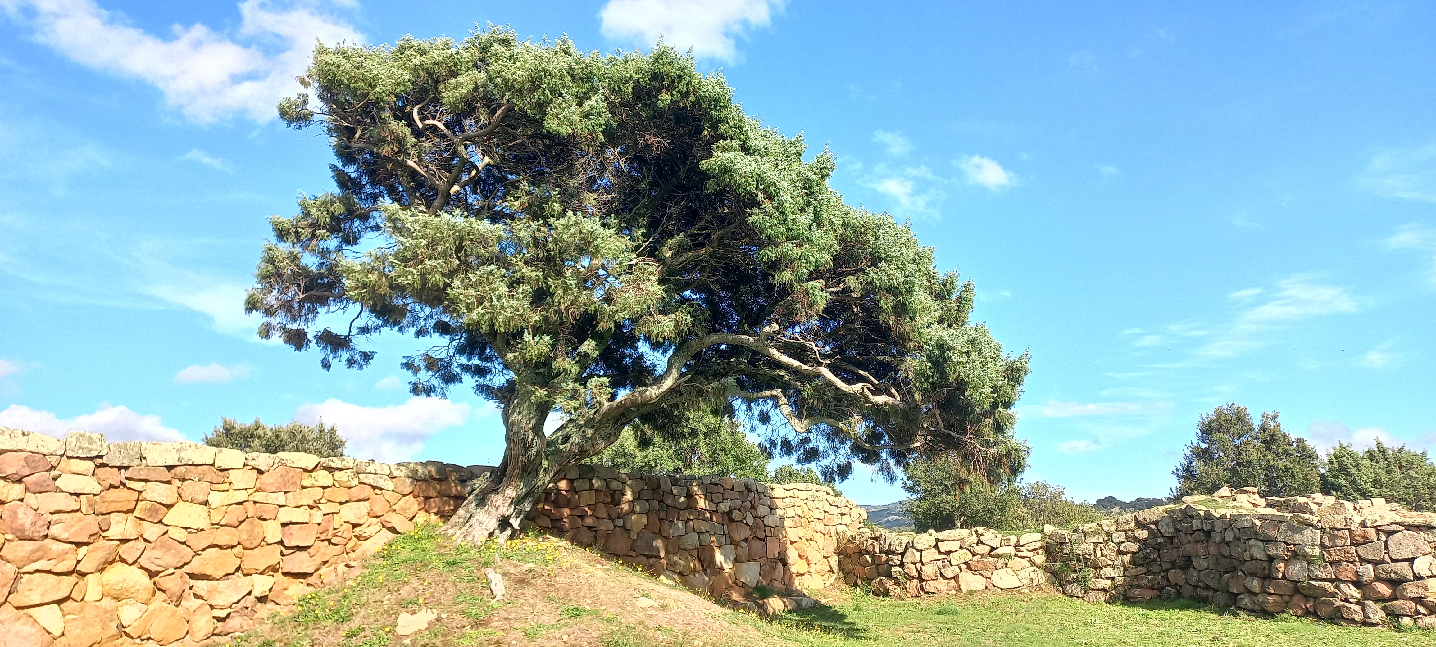 Bel ginepro comune presso il tempio del sito archeologico nuragico S'arcu e is forros. Il ginepro è stato risparmiato dagli scavi archeologici segno di grande rispetto ed oggi vegeta rigoglioso sopra il tempio.