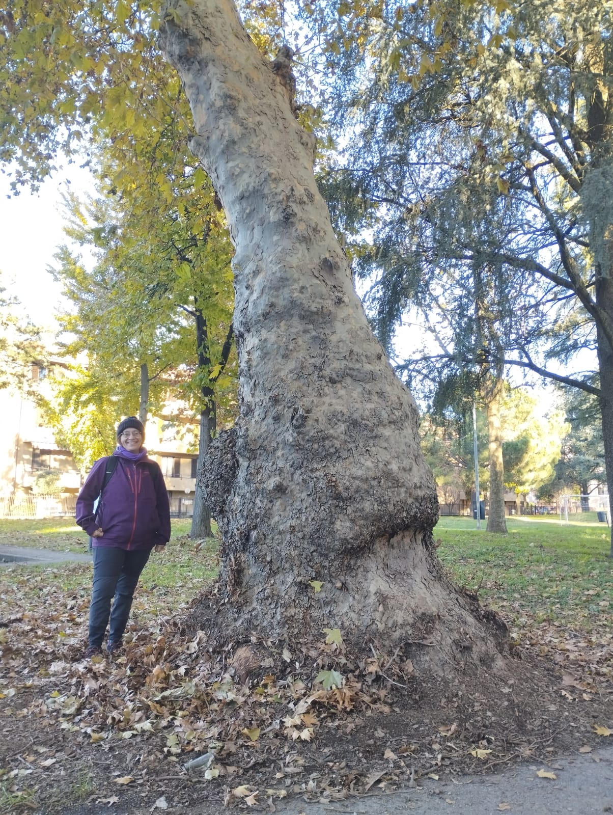 Platano del parco dedicato a Marco Simoncelli, con base allargata e escrescenza tumorale tonda
