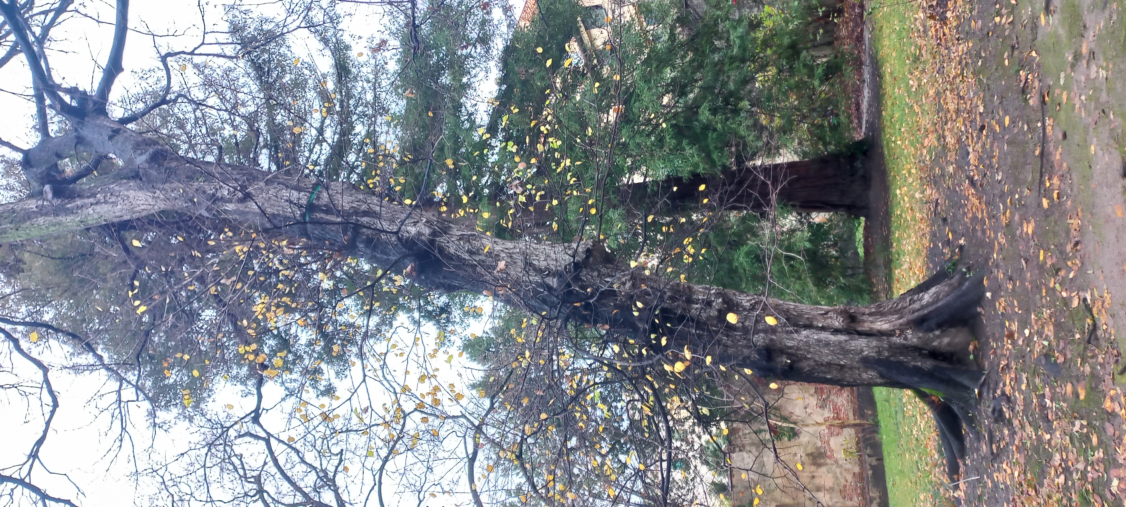 Albero dal fusto obliquo e strozzato da un cavo metallico messo per sostenere una vicina quercia.