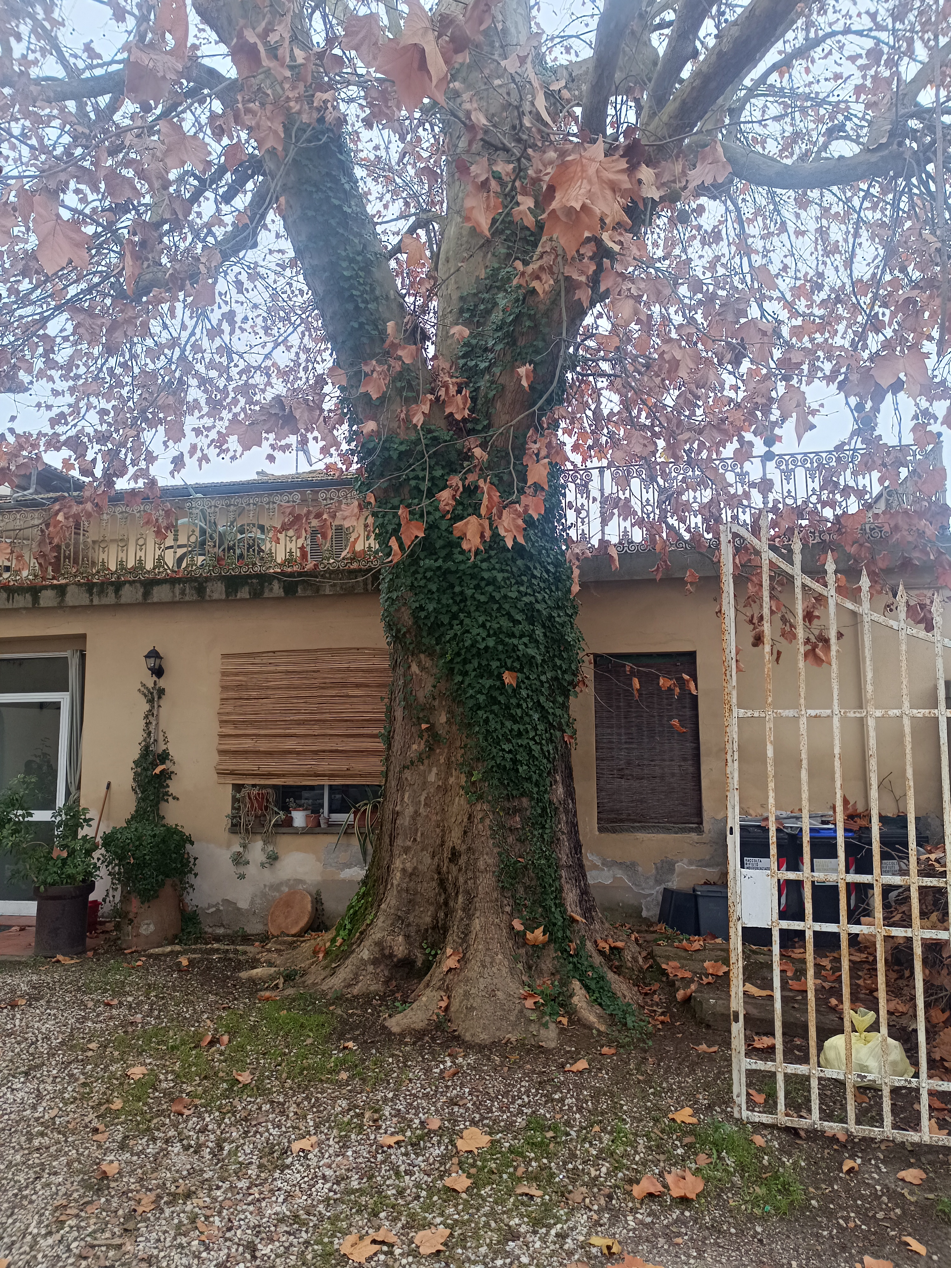 Situato in una corte accessibile dalla strada che attraversa l'abitato di S.Miniato PI e circondato da costruzioni recenti rispetto alla età di questo Platano,le sue radici stanno avendo la meglio sulla vecchia pavimentazione e forse degli edifici intorno. Dubito che vivrà ancora a lungo, sicuramente lo taglieranno completamente.
