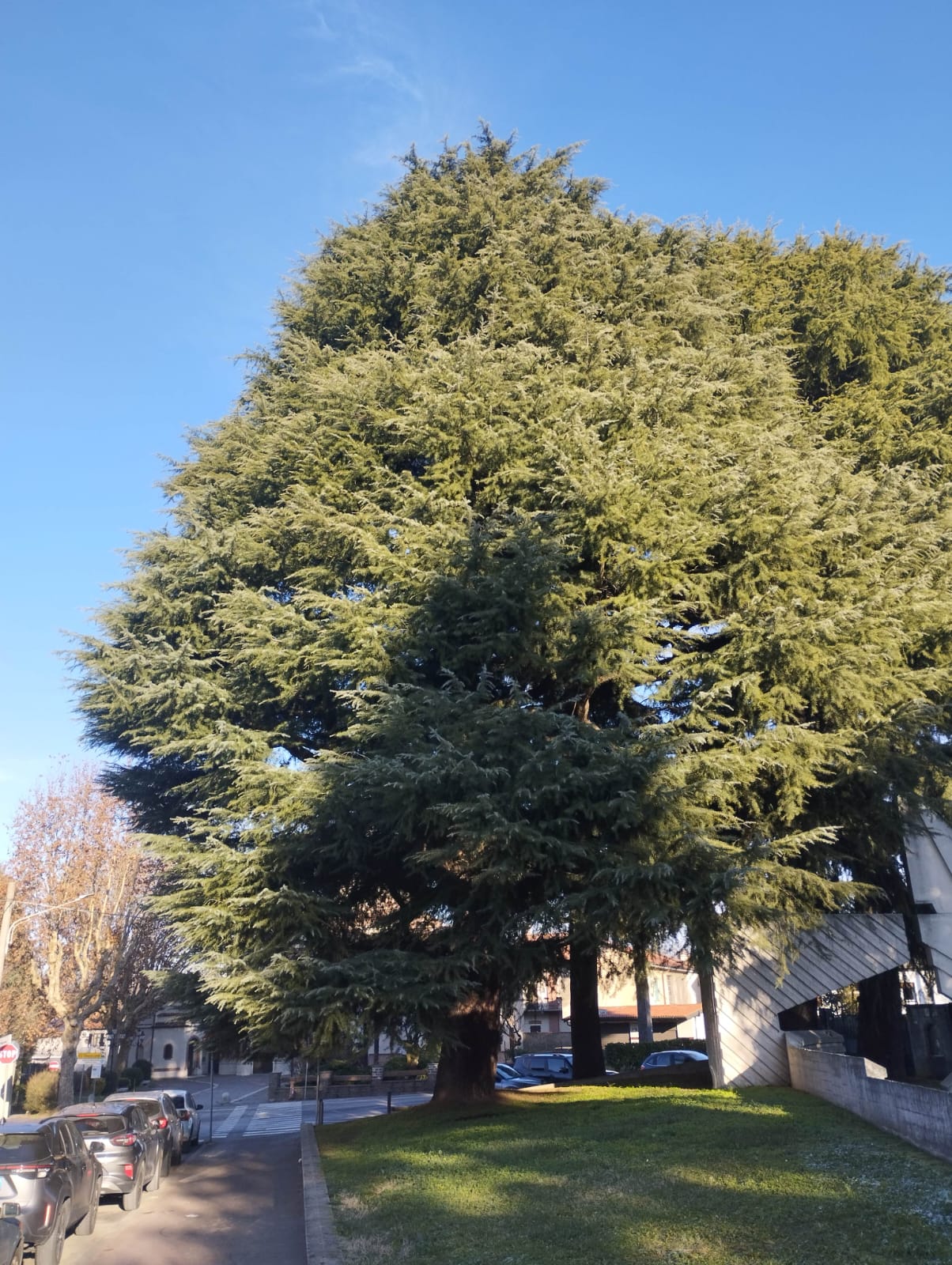 4 deodara coetanei,ma con misure rilevanti solo per tre di essi.Al maggiore è stato riservato poco spazio alle radici,per cui suo malgrado,sta spingendo controllo il muro in cemento armato che lo costringe nella sua aiuola.