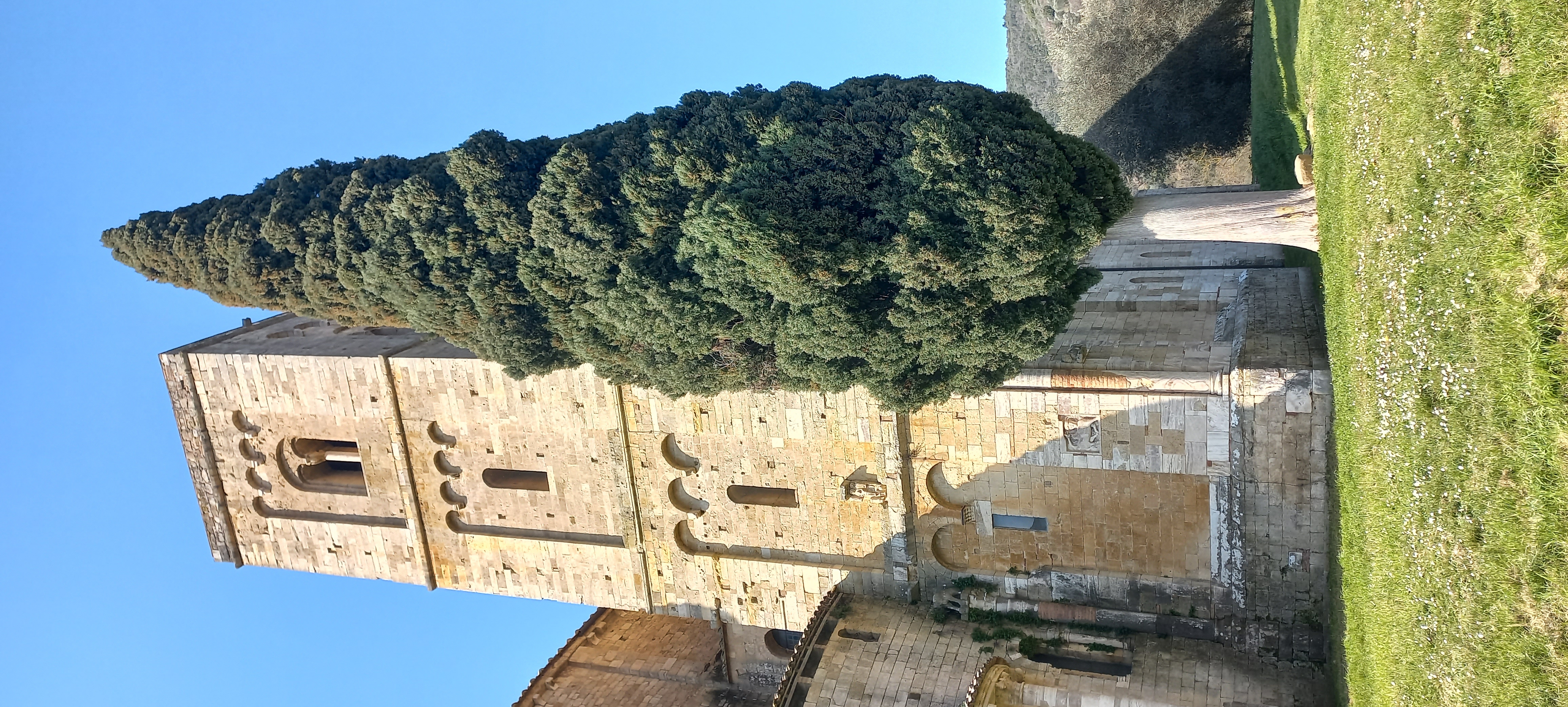Un'immagine da cartolina quella composta dall'abbazia di sant'Antimo ed il cipresso. Luogo ricco di storia e bellezza. Intorno all'abbazia ci sono alcuni olivi di dimensioni notevoli.