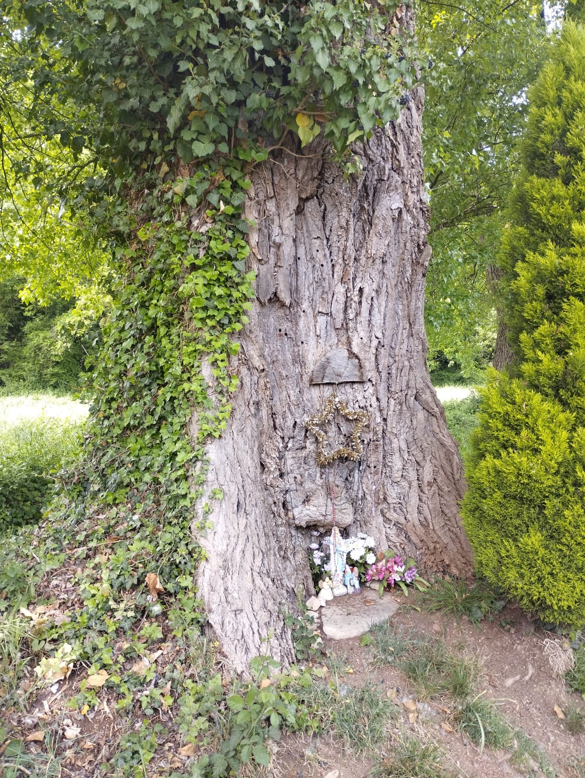 Esemplare il cui tronco è ricoperto di edera;su una nicchia naturale sul lato est è presente una Madonnina,sulla quale una coroncina recitava "Madonna della Pace". SS.