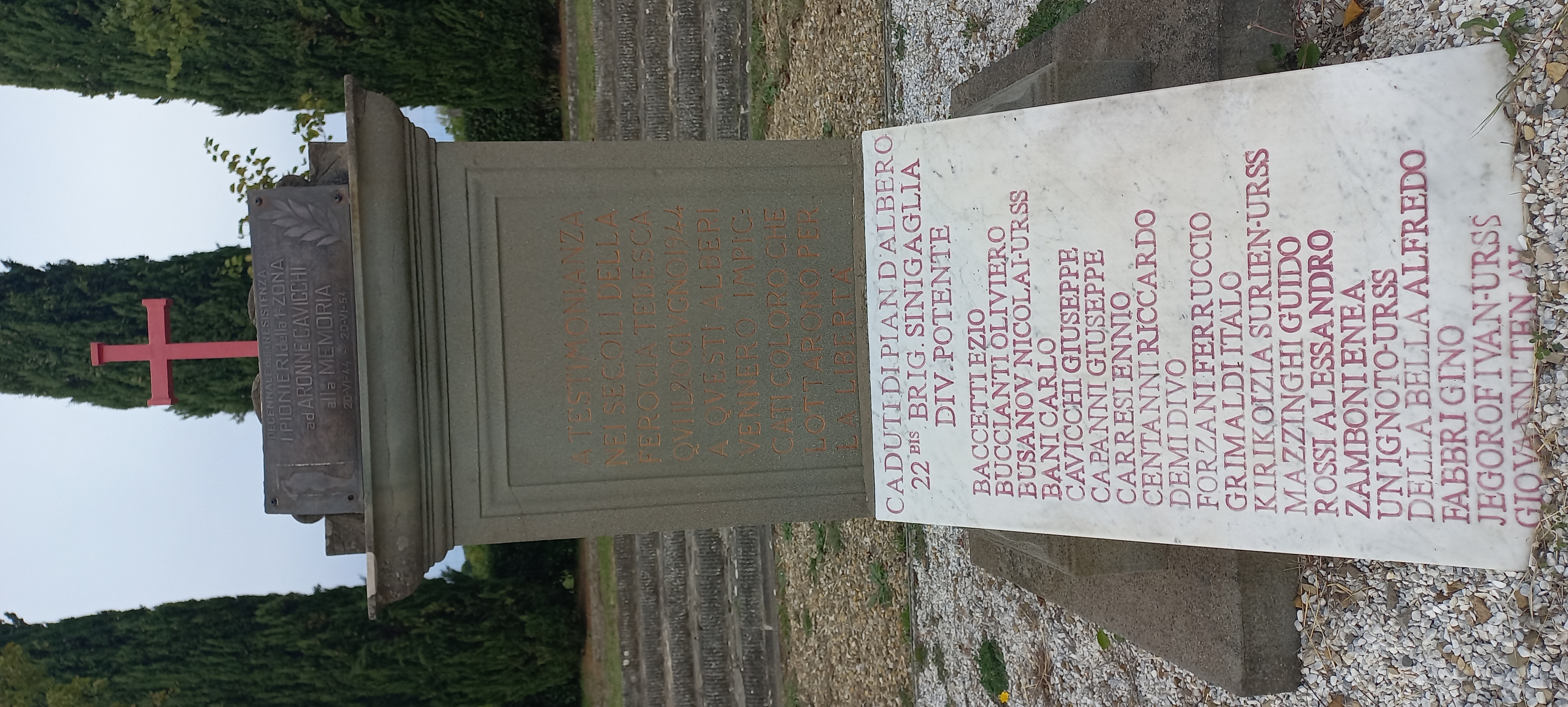 A questi 2 alberi il 20 giugno 1944 vennero impiccati dalle furie naziste 18 innocenti. Cavicchi Aronne, il più giovane aveva soli 15 anni.