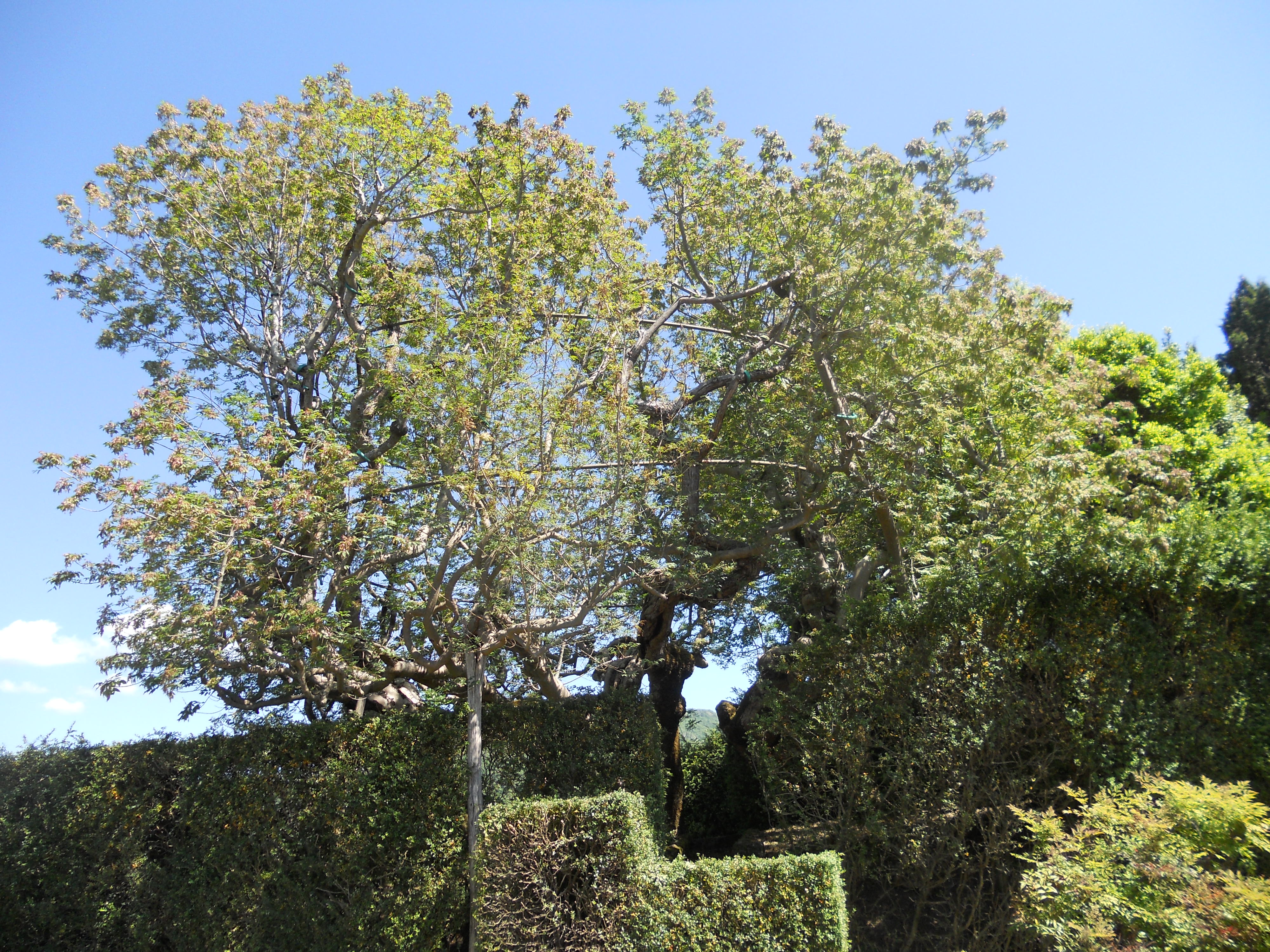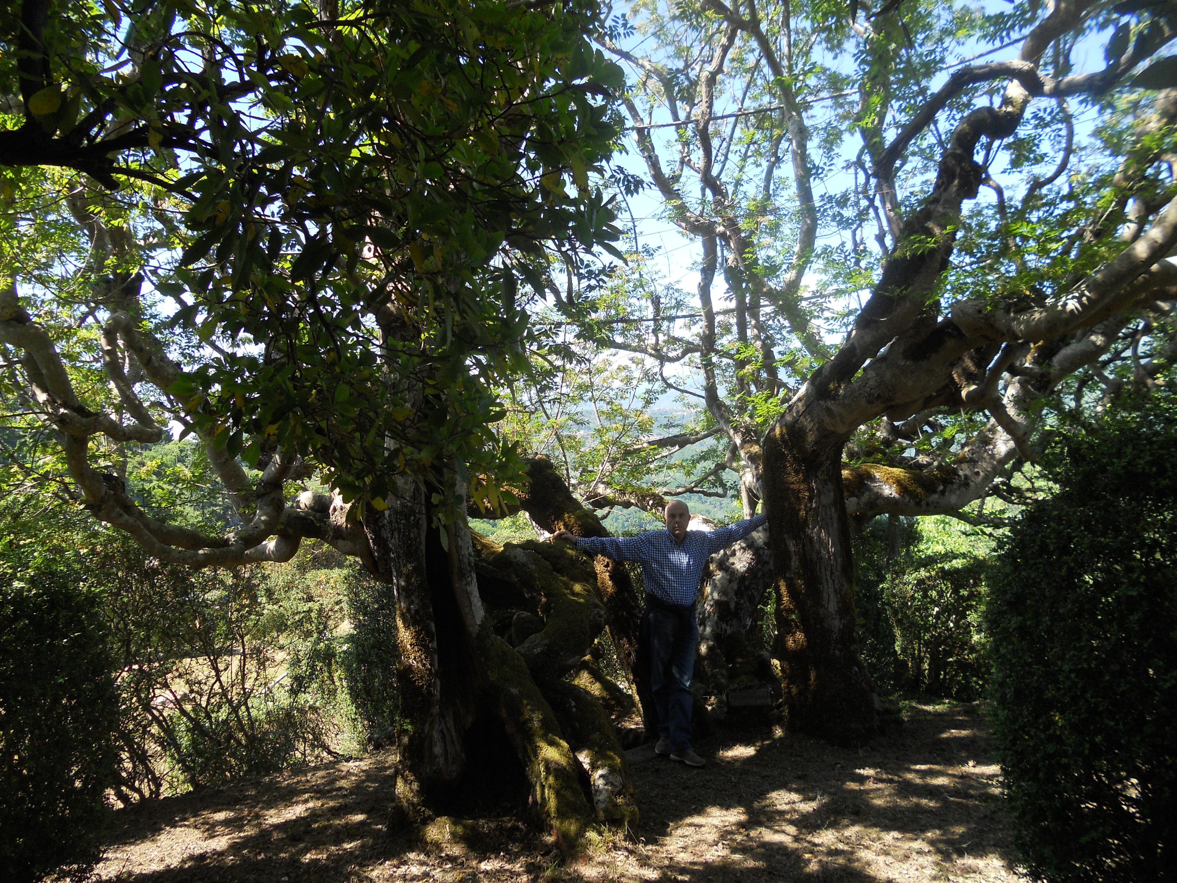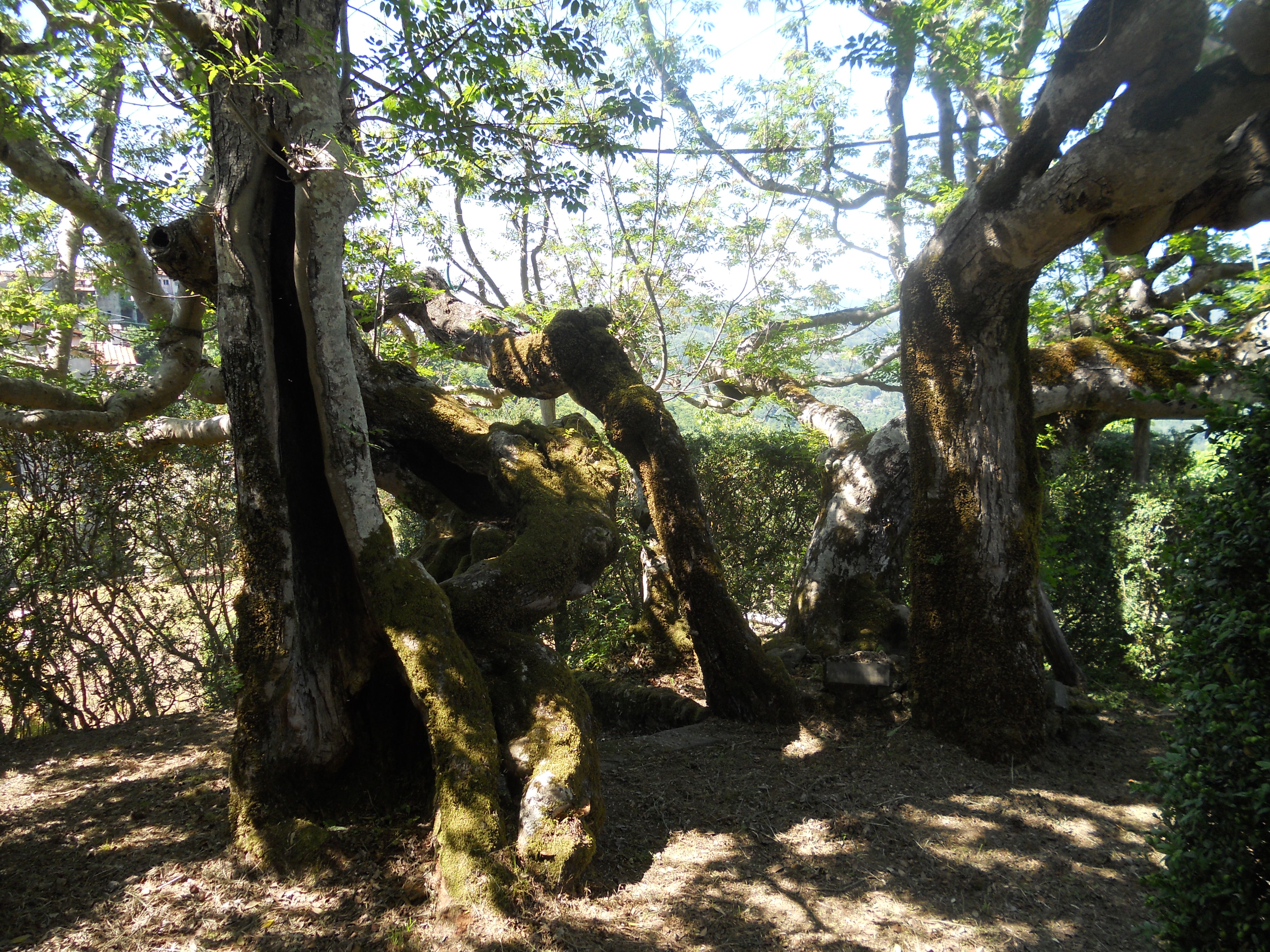 Si tratta di un gigantesco frassino, un orniello (Fraxinus ornus) alto circa 10 m alla cui base figura una lapide con la scritta “Piantato nel 1600”. Ma quello che interessa in particolare è la sua conformazione: infatti, ormai da tempi lontani, le sue 4 branche principali (di cui la maggiore misura oltre 5 m di circonferenza) sono state modellate in modo da creare un vuoto centrale che viene a formare, ad una altezza di circa 3 m, una specie di sporgenza su cui veniva poggiata una piattaforma di forma rotondeggiante, del diametro di circa 10 m, sul cui perimetro venivano fissati i rami intrecciati che poi proseguivano verso l’alto ad ombreggiare la piattaforma stessa.