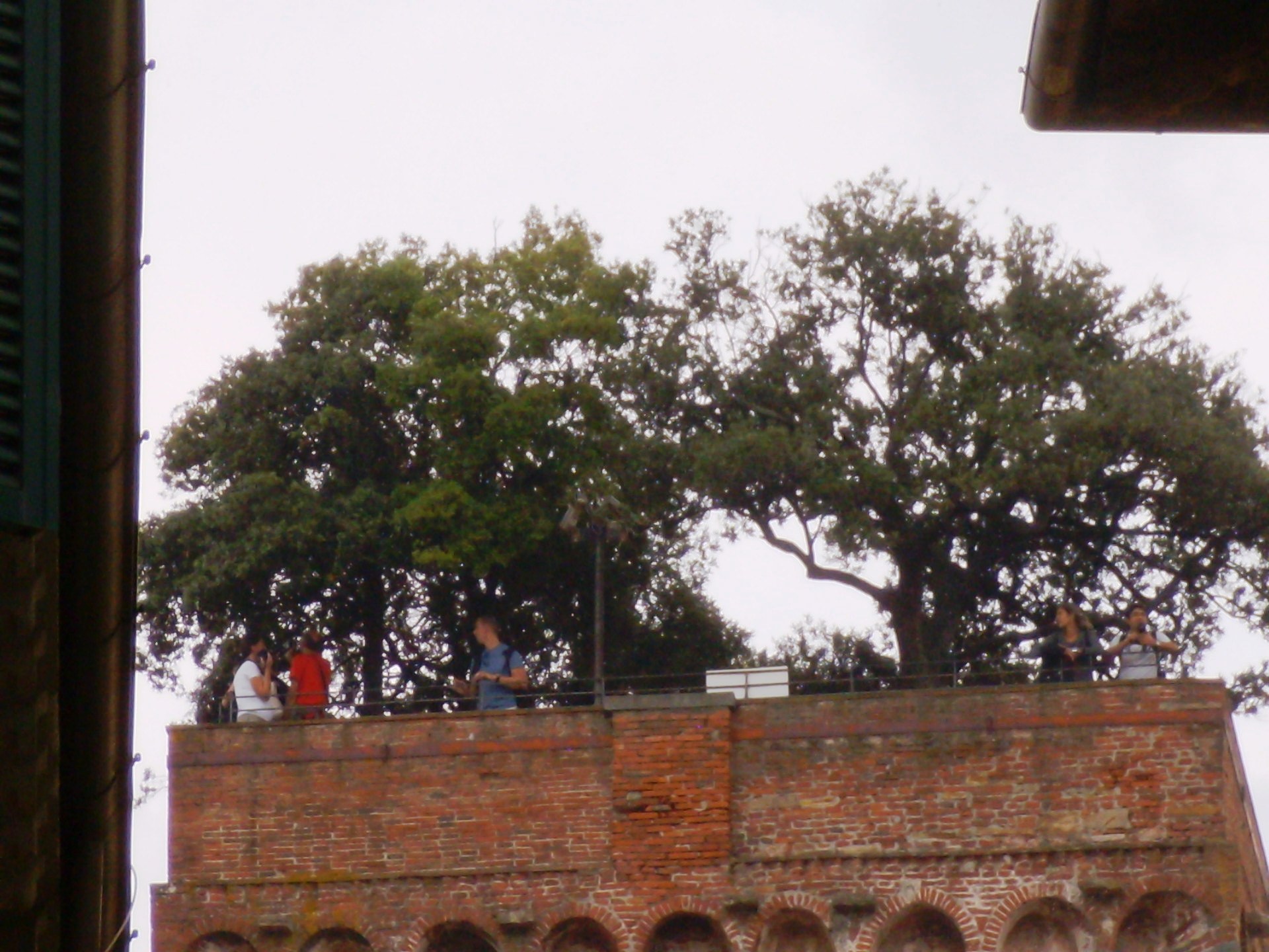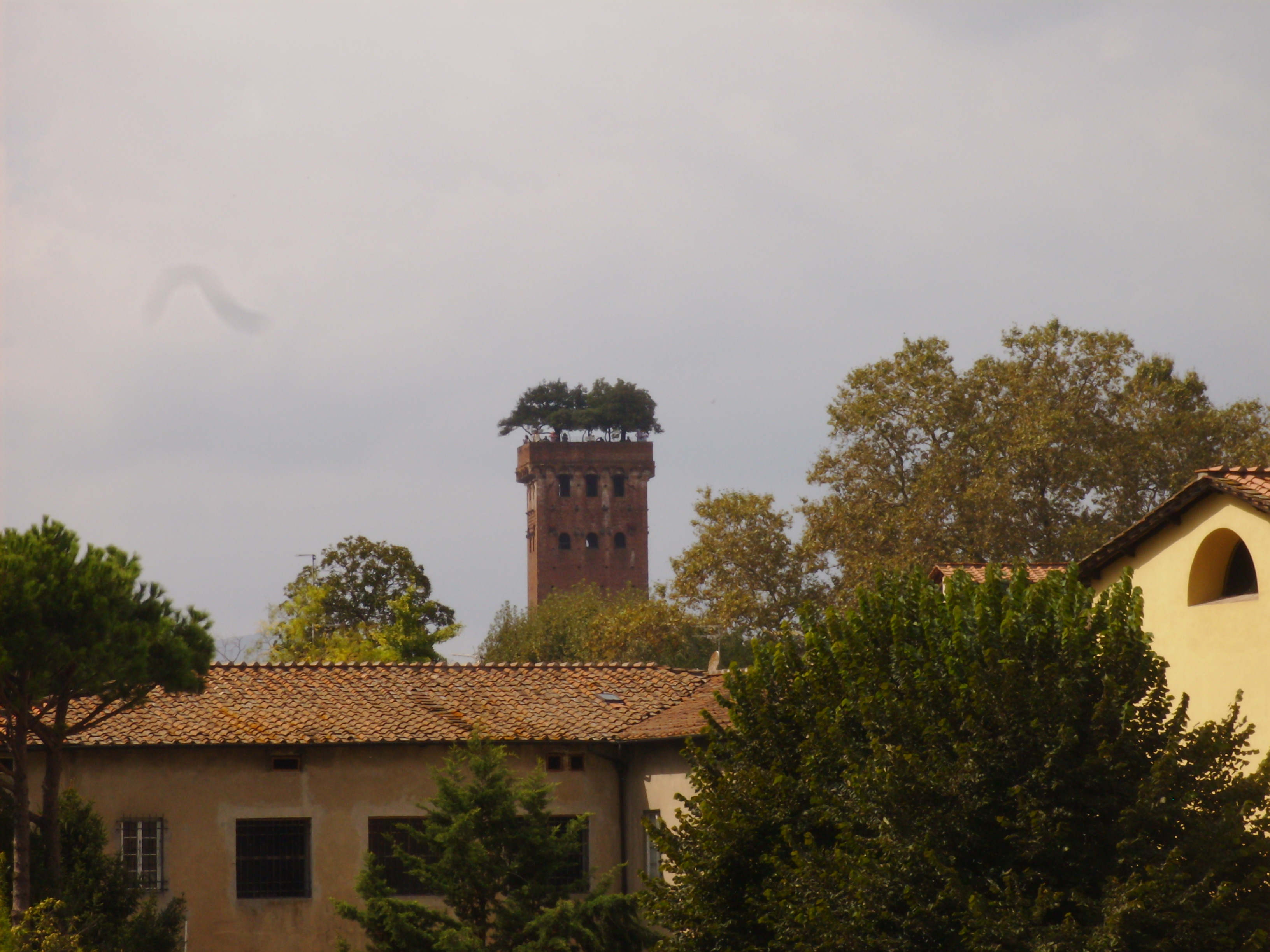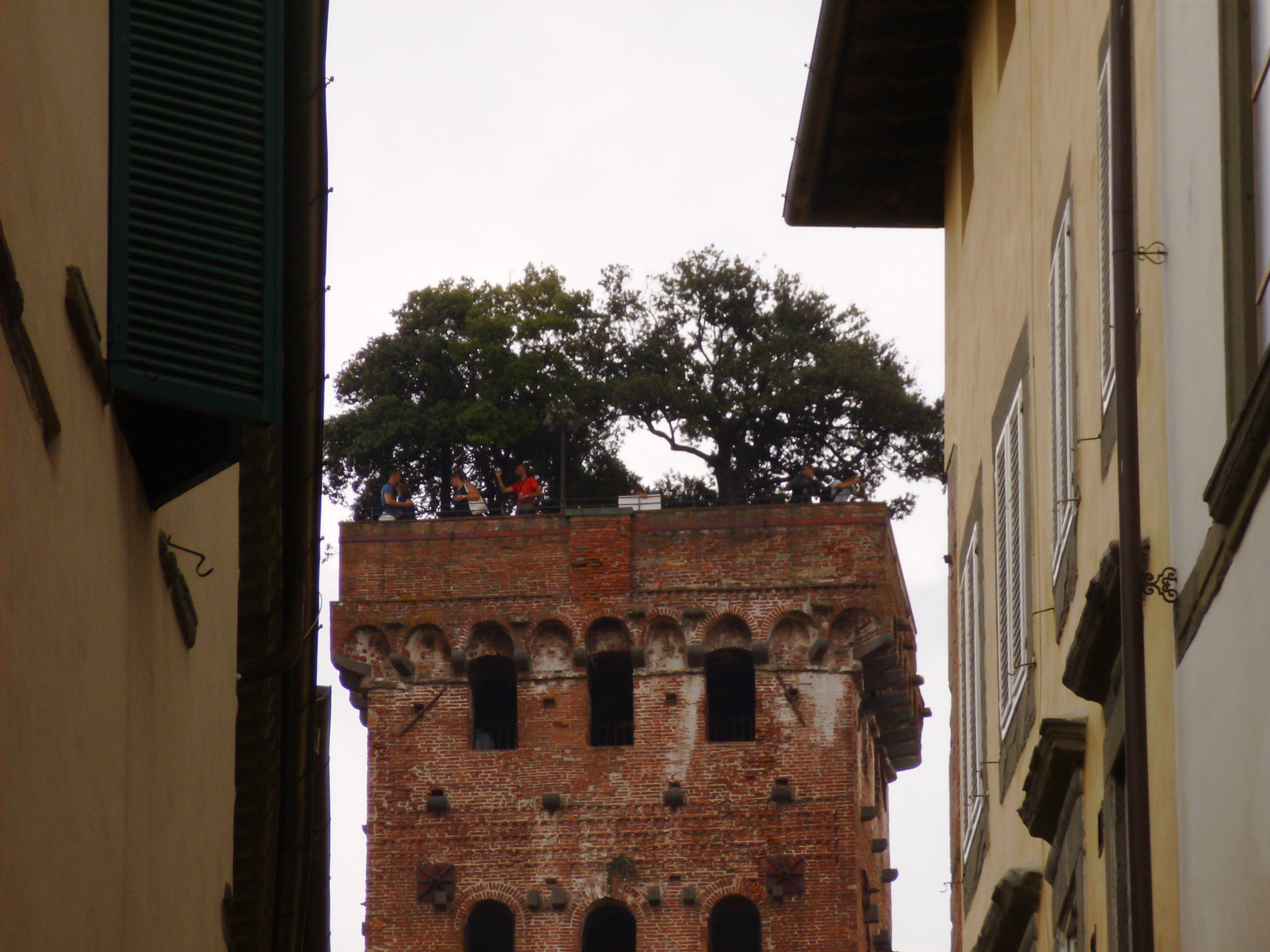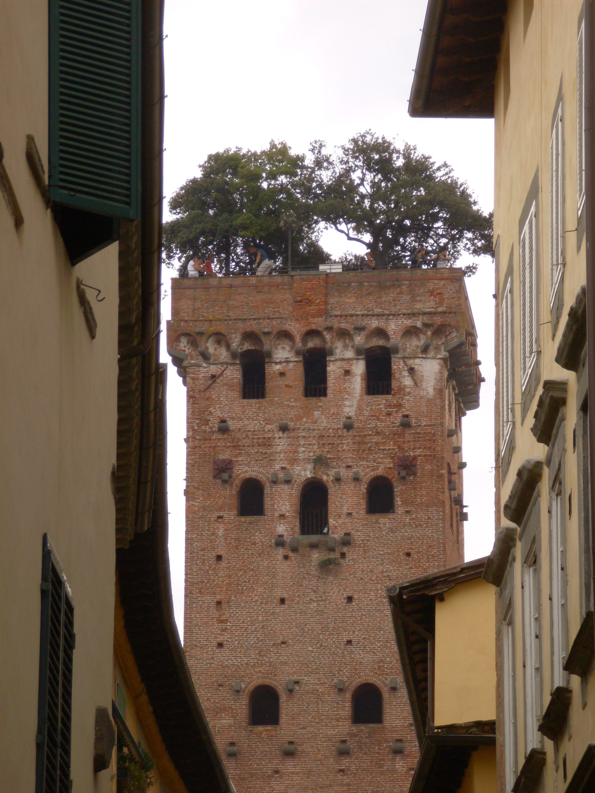 Elenco regionale degli alberi monumentali, SCHEDA N. 94; Gruppo di 7 lecci (circonferenze di m. 0,80-0,45-0,50-0.20-0.50-0,45 e x) in giardino pensile sulla sommità della Torre Guinigi simbolo della Città di Lucca. Il giardino pensile è costituito da un cassone murato riempito di terra, nel quale sono state messe a dimora sette piante di leccio. Non si sa esattamente quando il giardino fu realizzato, ma in un'immagine contenuta nelle Croniche di Giovanni Sercambi (secolo XV), si può vedere che tra le tante torri di Lucca ve n'era una coronata d'alberi. Si suppone dunque che l'impianto sulla Torre Guinigi sia molto antico, anche se i lecci oggi presenti sono stati sicuramente ripiantati nel tempo.