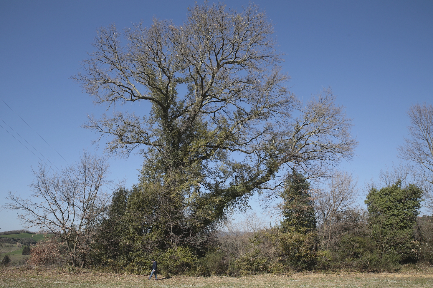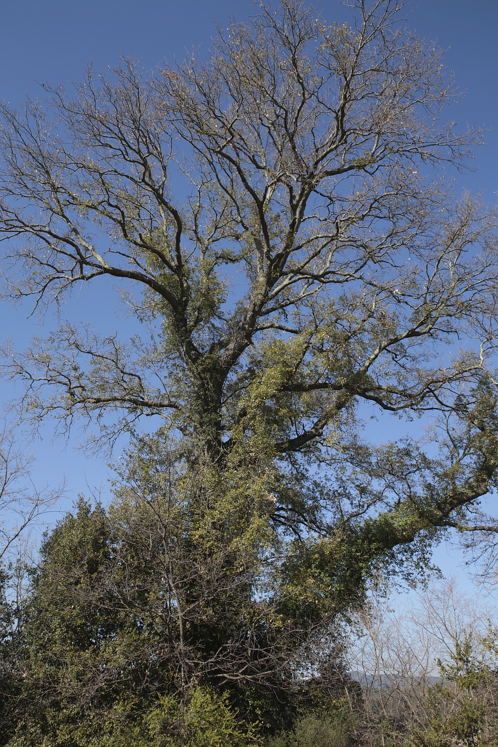Grande quercia classificata da Valido Capodarca come cerro-sughera (Quercus x crenata Lam.) mentre il CFS nelle rilevazioni dl Censimento nazionale (1982-1984) ed altri autori la indicano come leccio-sughera, specie scelta in questa scheda. La pianta è radicata su una ripida scarpata a margine di un campo, ben visibile ma con l'impossibilità di avvicinarsi al fusto, che è ricoperto da una vigorosa edera che si sviluppa fino ai rami più alti, sia per la forte pendenza che per la presenza di arbusti e rovi alla sua base, ragion per cui non è stata effettuata una nuova misurazione della circonferenza del fusto. La chioma è sbilanciata, sviluppata solo su un lato e di fatto costituita da un fusto centrale eretto, verticale e da un grosso ramo che si stacca dal tronco principale con un angolo di circa 60 gradi. Un sopralluogo del sig. A. Gulminelli il 25-03-2019 rilevava le caratteristiche morfologiche delle foglie persistenti (dell'annata precedente) e delle ghiande aventi cupola simile a quella del cerro (Quercus cerris L.) rimane pertanto dubbio sull'esatta determinazione della specie. Le misure sono quelle indicate su fonti storiche e bibliografiche.