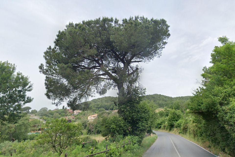 discreto pino radicato a margine strada (via Canale 47) all'interno di proprietà privata recintata.,